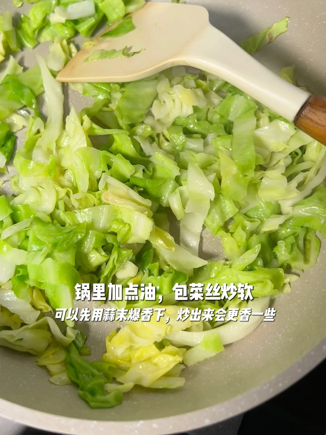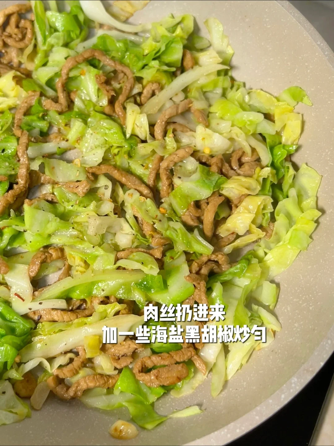 4⃣️ 锅里加少许油,蒜末爆香后放包菜丝炒软,然后加肉丝、少许海盐黑胡椒粉,翻炒均匀。