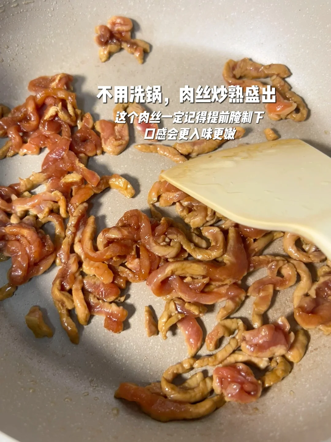 3⃣️ 不用洗锅,炒香肉丝,盛出备用;