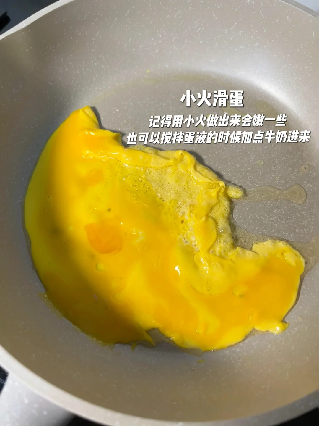 2⃣️ 锅里加少许油,倒入鸡蛋液,小火滑蛋;