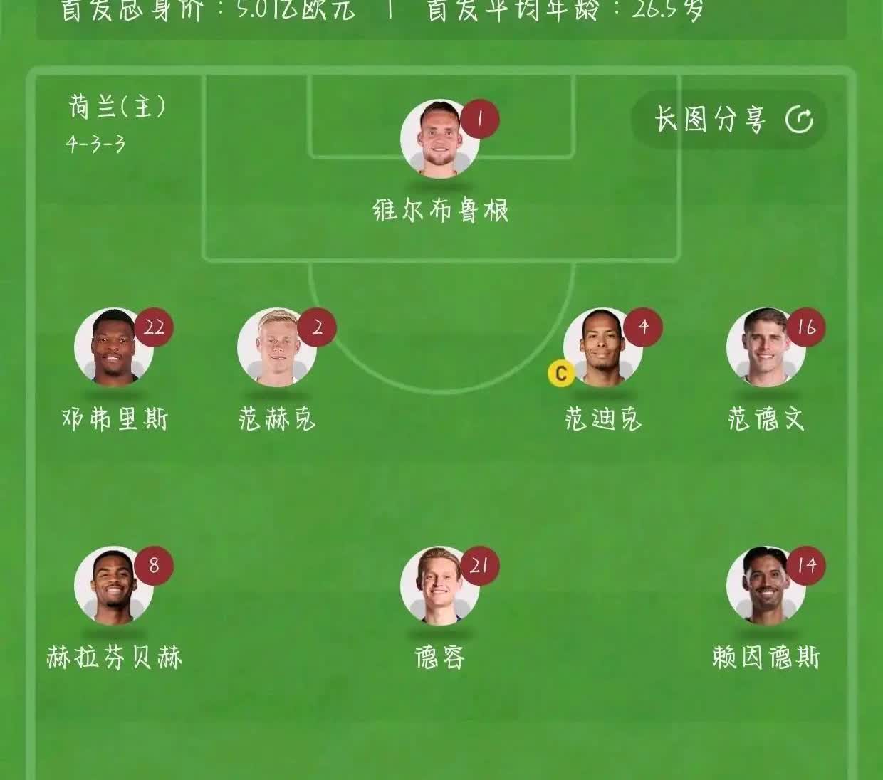 有没有人觉得荷兰现在实力很强? 如果拿欧洲杯冠军,范戴克有望金球奖,以前荷兰神锋强后卫弱,导致多年无冠。 现在荷甲后卫强,前锋有点弱。 首发前锋德佩31岁,已经去巴西联赛踢球了,但是他在欧洲杯预选赛,5场比赛4球表现很不错。 加克波3球,西蒙斯3球,这锋线合理呀。 赫拉芬贝赫+赖因德斯+德容,很好的中场。 后卫天团范戴克领衔,邓弗里斯很强,范德芬也是热刺主力,范赫克是布莱顿主力。 门将也是英超布莱顿的,都是中上水平。 我认为荷兰有机会冲击欧洲杯。[赞]