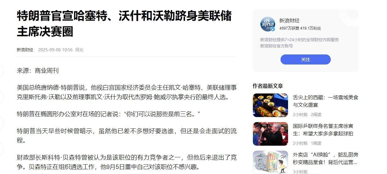 9月6日,特朗普称哈塞特、沃什和沃勒是美联储主席的前三人选。特朗普明确表示没说过一定会选哈塞特,但他确实是前三候选人之一,原本的第四人选财长贝森特已退出,现在最终名单就剩这三位。 美联储这机构,相当于美国经济的定海神针,负责管利率、控通胀、稳就业,特朗普一直对现任主席鲍威尔不满意,觉得他降息太慢,拖了经济增长的后腿。 现在鲍威尔任期明年五月就到期,特朗普显然想换个更合自己心意的人上来,推一把他那套刺激经济的计划。 这三位候选人,哈塞特、沃什、沃勒,背景各不相同,但都有个共同点:他们都支持降息,愿意让货币政策更宽松,配合特朗普的经济目标。 哈塞特是特朗普身边的红人,经济顾问干了好几年,对总统的想法门儿清,他一直主张通过低利率给经济加把劲,刺激消费和投资。 这思路跟特朗普的“美国优先”政策高度吻合,想通过宽松货币政策让制造业回流、基建项目加速。 不过哈塞特这种激进的降息主张也有风险,毕竟通胀这头猛兽还没完全被驯服,降得太猛可能让物价又起飞。 沃什老兄在金融圈子里名气不小,当年金融危机时他在美联储当过理事,经验丰富,他更偏向灵活的政策,既不一味降息,也不死守高利率,主张根据市场情况来调整。 沃什的华尔街背景让他在应对危机时很有底气,但他跟特朗普的亲信圈子不算太近,这可能会让他在竞争中稍微吃点亏。 而沃勒作为现任美联储理事,他在内部的连续性是个大优势,他最近几次发言都提到就业市场有点疲软,愿意适度降息来稳住经济。 沃勒的立场相对中庸,喜欢看数据说话,不太会搞大动作,这种务实的风格,让美联储的政策过渡更平稳,但也可能让特朗普觉得他不够“给力”。 其实从今年夏天开始,特朗普团队就在为鲍威尔接班人选忙活了,贝森特本来是个重要推手,帮着筛选候选人,但现在他退出了,焦点就全集中在这三位身上。 特朗普在白宫接受采访时提到,哈塞特确实是前三,但他没打包票说一定选他,估计还在权衡,毕竟选谁来干这个活,不光看能力和立场,还要看跟自己的默契度。 特朗普的算盘很清楚:他想让新主席配合自己的减税和关税政策,降低借债成本,刺激经济增长。 这三位候选人里,哈塞特跟特朗普关系最近,沃什的经验最老到,沃勒的内部视角最接地气,无论谁上台,都会比鲍威尔更倾向宽松政策。 信息来源:新浪财经 特朗普官宣哈塞特、沃什和沃勒跻身美联储主席决赛圈
