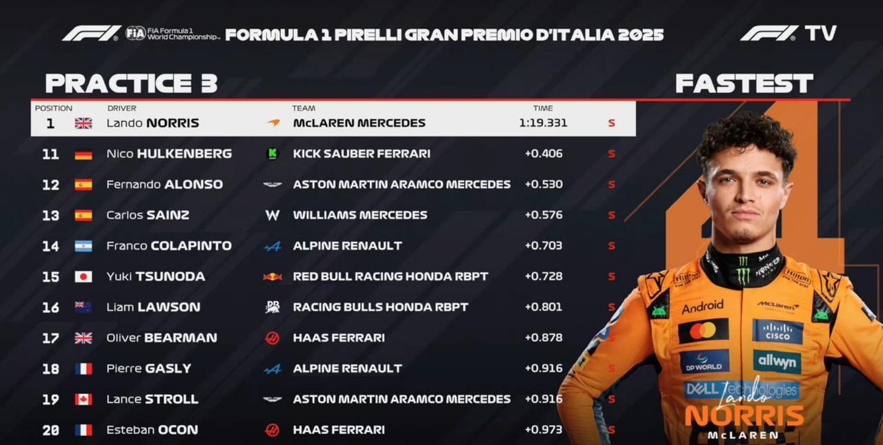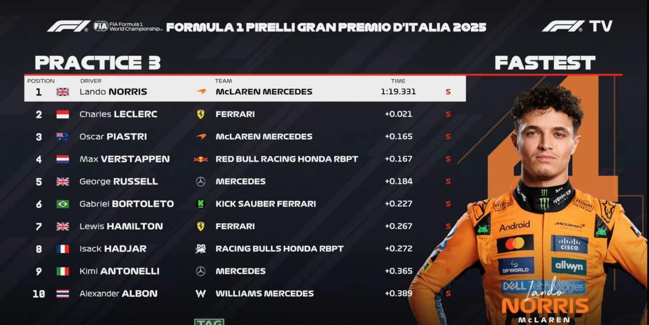 意大利大奖赛三练结束,诺里斯1:19.331再次拿到第一,勒克莱尔落后0.021