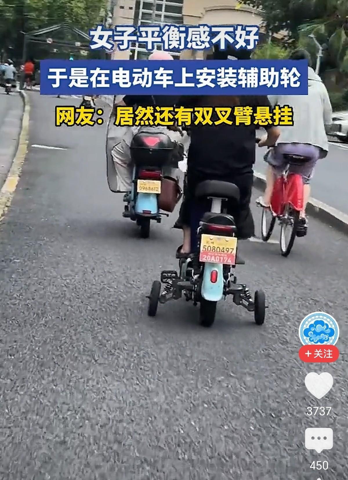 人怎么能这么聪明! 一女子会骑电动车,但是她平衡感不好,骑车上路没有安全感,于是她想了一个办法,给自己的电动车装了俩辅助轮。 这下子倒是平衡了,开起来安全感杠杠的。但是咱们的网友说了,这种辅助轮不中用,装了之后开不快,最后还得拆。 可能这位女子只是追求安全,不求速度,怎么着也比走路快吧。 有网友说,这算不算非法改装?会不会被警察叔叔抓?这个咱不懂,不好说。 还有网友问,这应该算是4轮车了,要考个C1才能上路吧? 我个人觉得这种辅助轮应该没啥用,如果真的好早就推广了,你们说是不是?