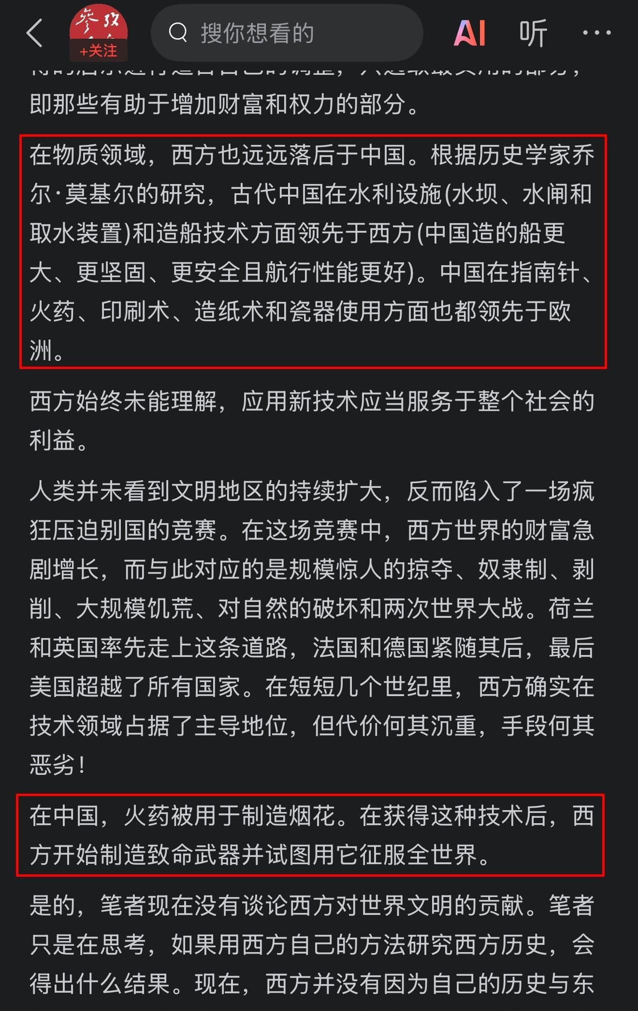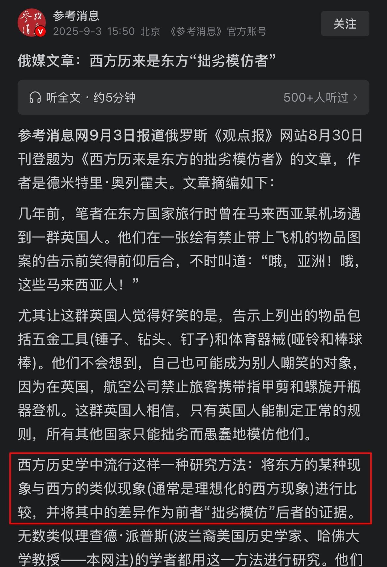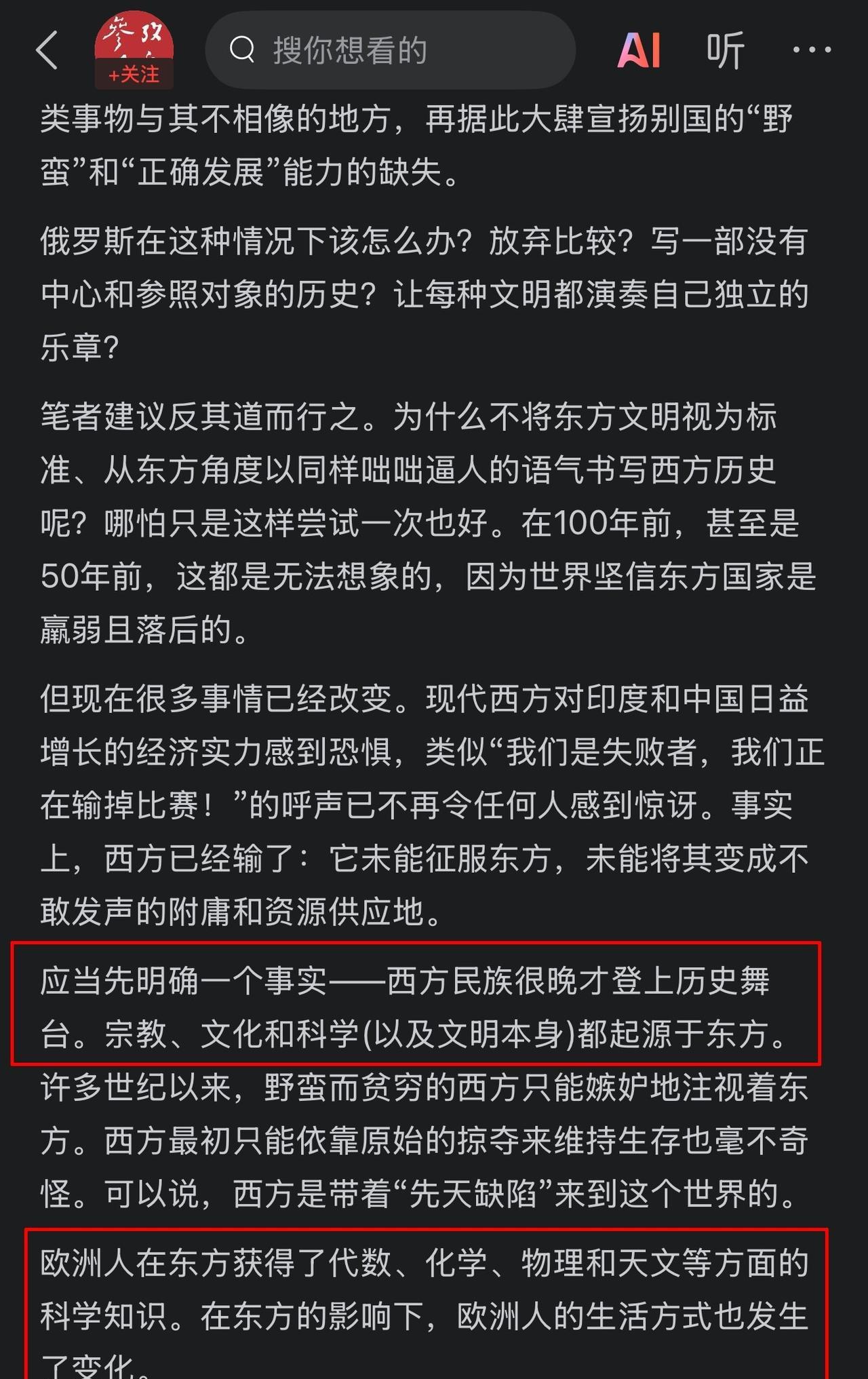 西史辨伪迎来官媒转发文章,看来这把火很可能越烧越大!前几天《参考消息》转发了一篇俄媒文章《西方历来是东方的拙劣模仿者》,文章比较长,可能大家没什么耐心看完,大家可以看我打红框的部分。文章从西方研究历史的一些底层做法开始刨根,认为西史就是先拔高自己的历史,再找东方历史做比较,然后用自己拔高的长处去比较东方历史的短处,从而获得自信和诋毁他人。其次,文章认为西方在宗教、科学、文化上都源于东方,比如代数、物理、化学天文等。其他的比如造船、四大发明等方面都落后于东方。这篇文章是否完全客观,我们也没办法在短时间内去论证。但能得到《参考消息》的转发,本身其实就代表了一种观点,这对西史辨伪来说应该至少算是一种态度吧,至少不是打压态度。 #秋日生活打卡季#