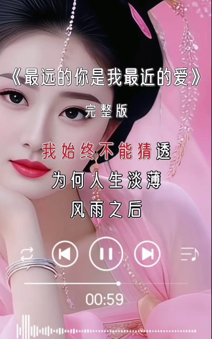 《最远的你是我最近的爱》完整版。 所有的爱都错过,别笑我懦弱,我始终不能猜透。人生风景在游走,每当孤独我回首,你的爱总在不远地方等着我。岁月如流在穿梭,喜怒哀乐我深锁,只因有你在天涯尽都等着我。夜已沉默,心事向谁说?夜已沉默,不肯回头,所有的爱都错过。事问谁说,别笑我懦弱,我始终不能猜透。为何人生淡薄,风雨之后无所谓拥有。萍水相逢,你却给我那么多。你挡住寒冬,温暖只保留给我。风霜寂寞,凋落在你的怀中。