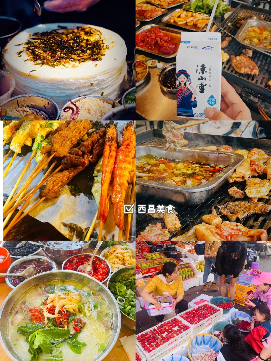 卷粉,炸洋芋,网烧,串烧,米线,草莓,凉山雪超好喝,网烧的话胡四哥和李小肠是网红店,味道真的挺不错的,米线我们吃的王记清香牛杂粉,也很推荐
