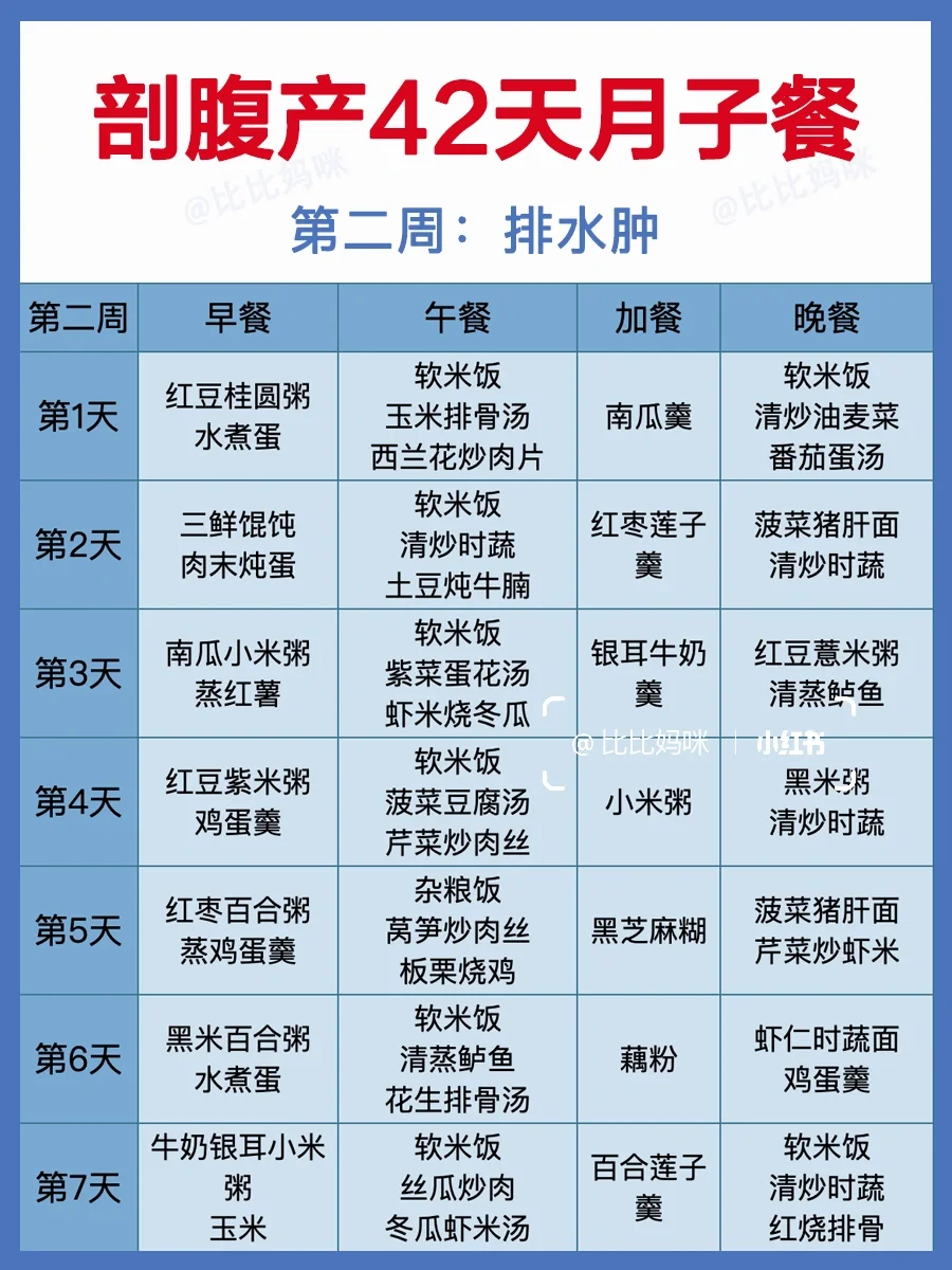 即将坐月子的孕妈妈看过来,特别是打算不请月嫂在家坐月子的姐妹,收好这份剖腹产42天月子餐食谱超全攻略,直接打印出来抄作业,不用再纠结月子餐吃什么了,都帮准妈妈们整理好啦~希望所有姐妹都能安心坐月子 · ⭕️本文内容包括: ✅剖腹产第一周月子餐:排气排恶露 ✅剖腹产第二周月子餐:排水肿 ✅剖腹产第三周月子餐:催乳 ✅剖腹产第四周月子餐:补气血 ✅剖腹产第五周月子餐:养气补生 ✅剖腹产第六周月子餐:体质恢复 ✅剖腹产后注意事项