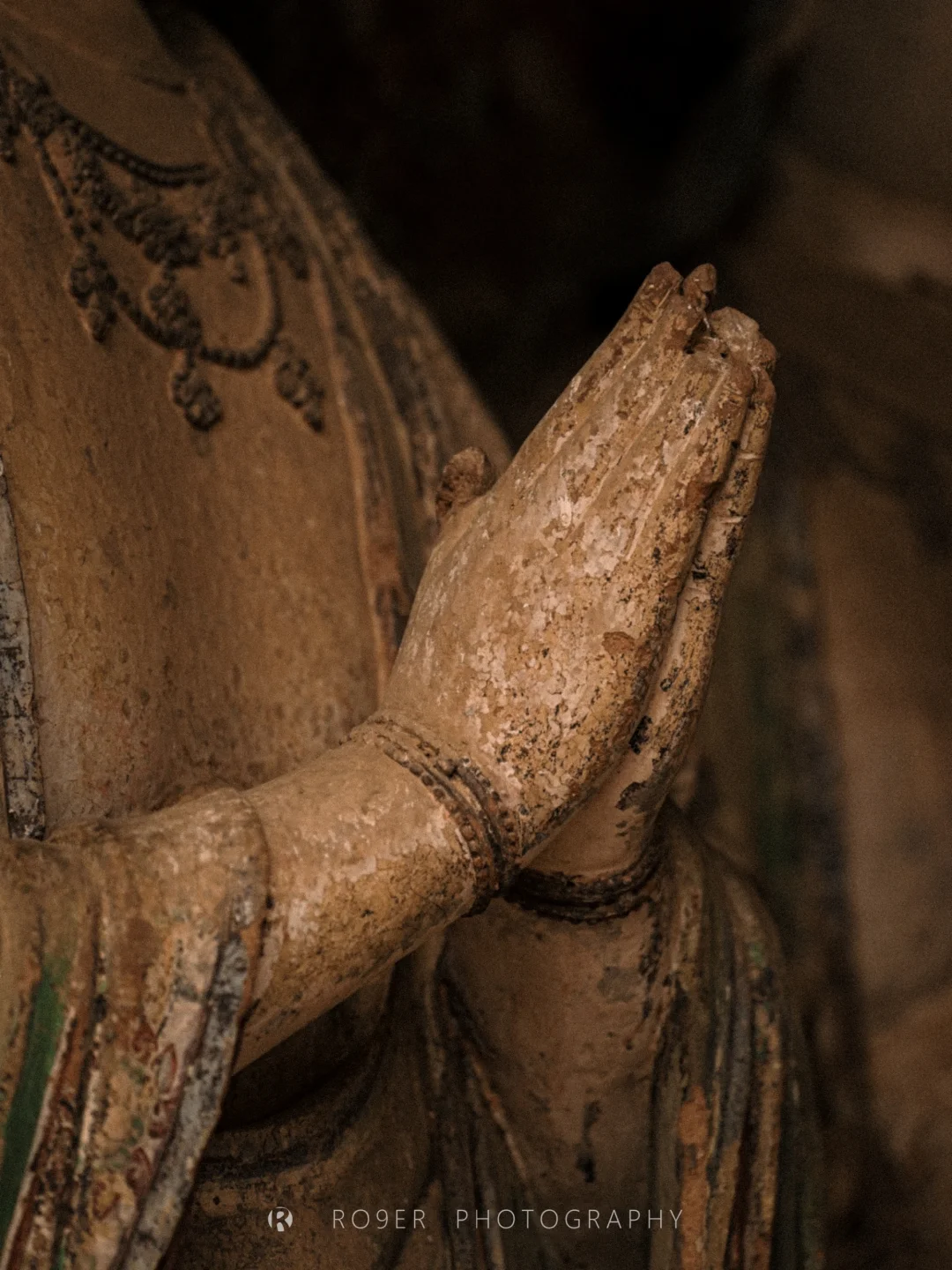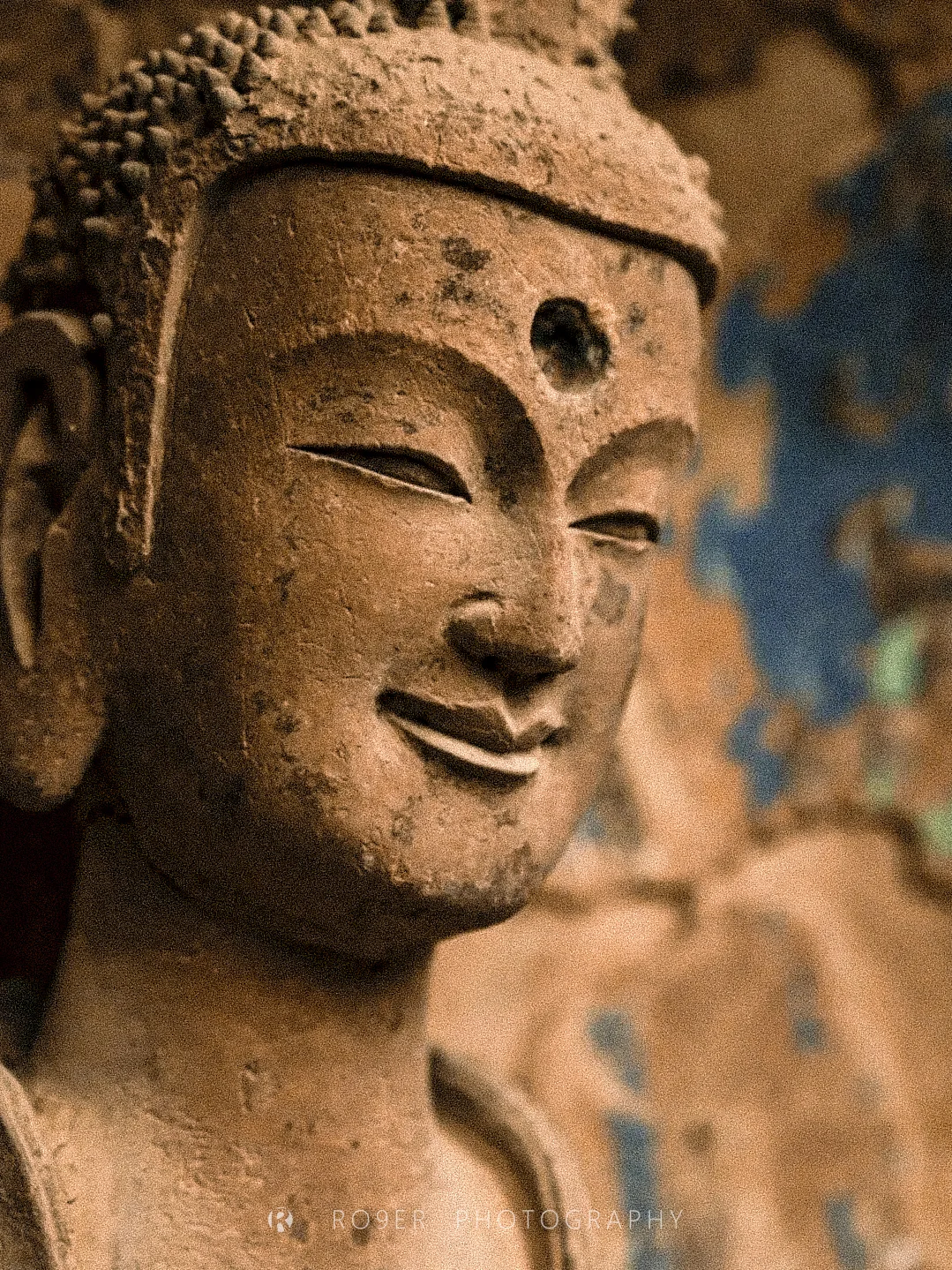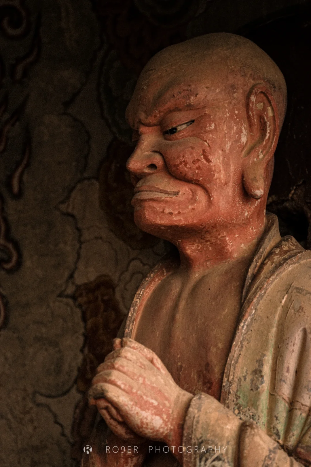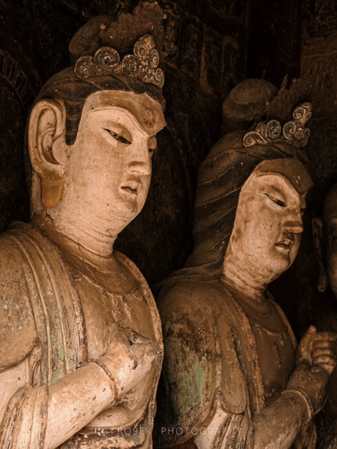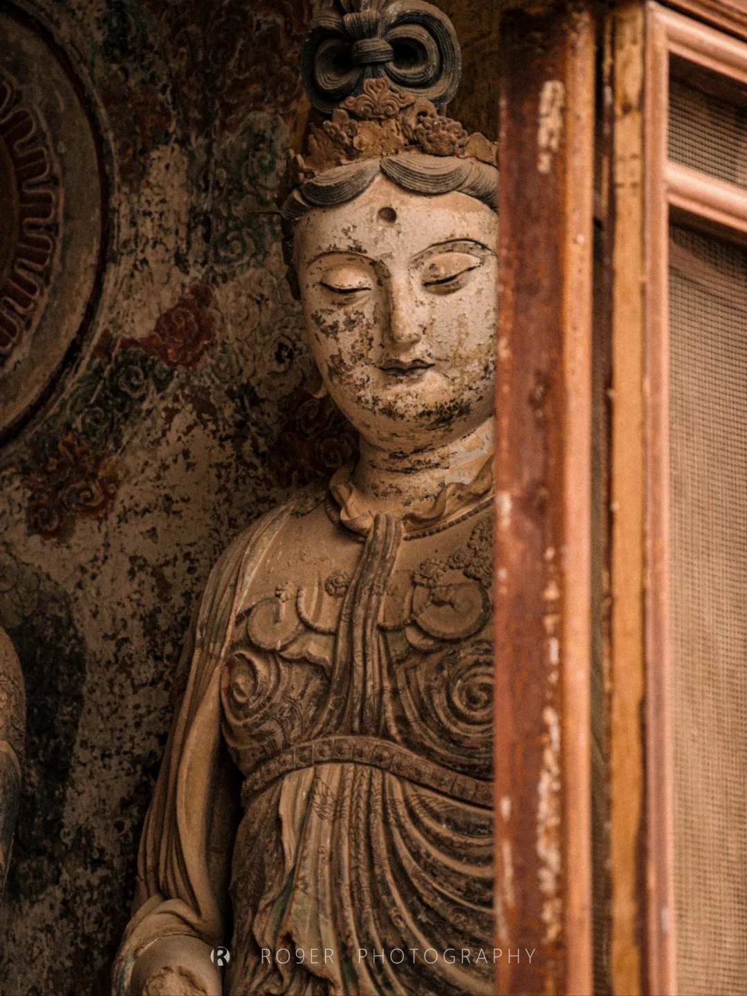 👉七间佛龛均置诸佛众弟子菩萨像,经宋代重修,形象丰满写实,颇具世俗化特征,而周身彩绘则是明清时期典型的精美繁复的做法