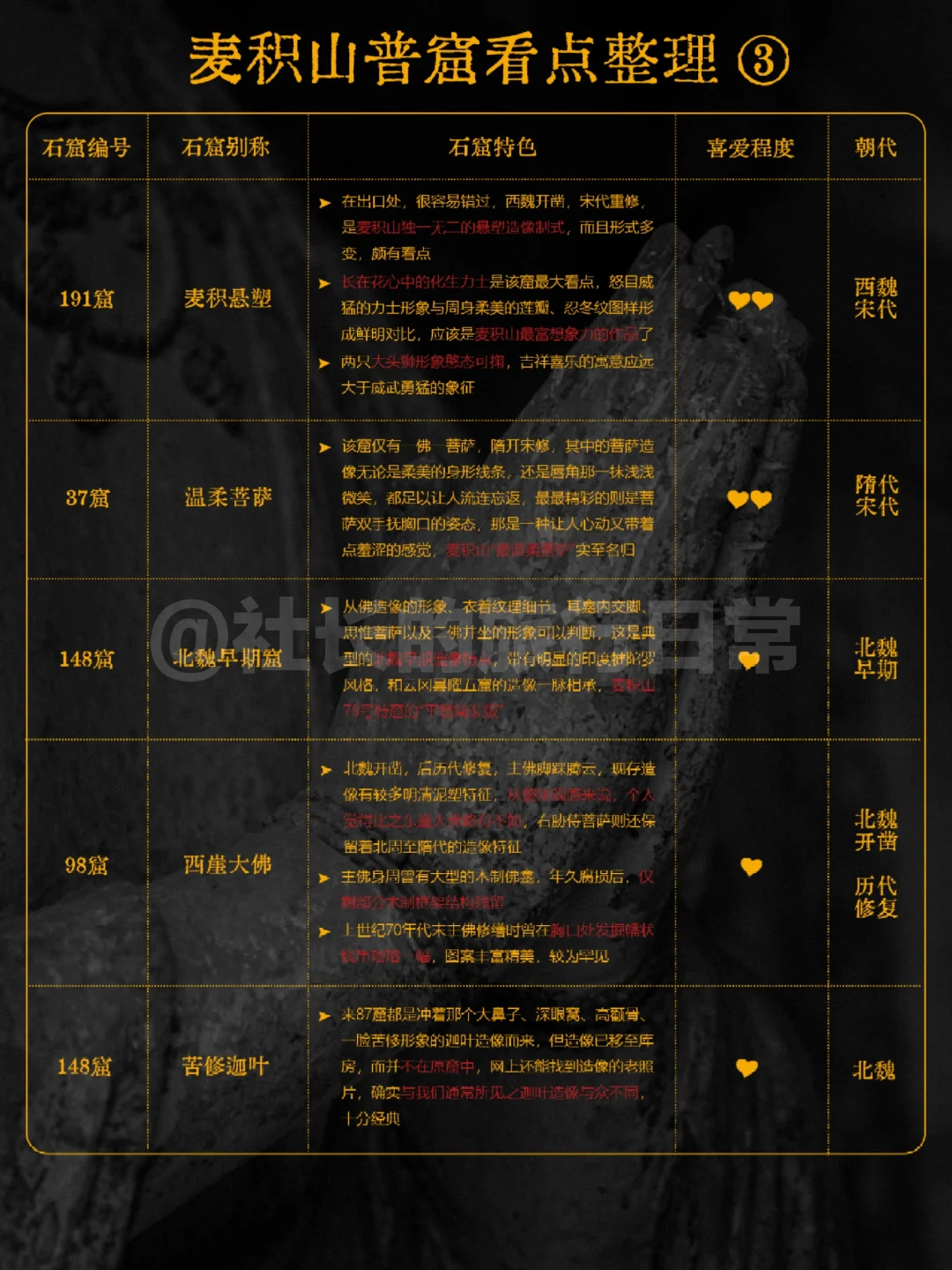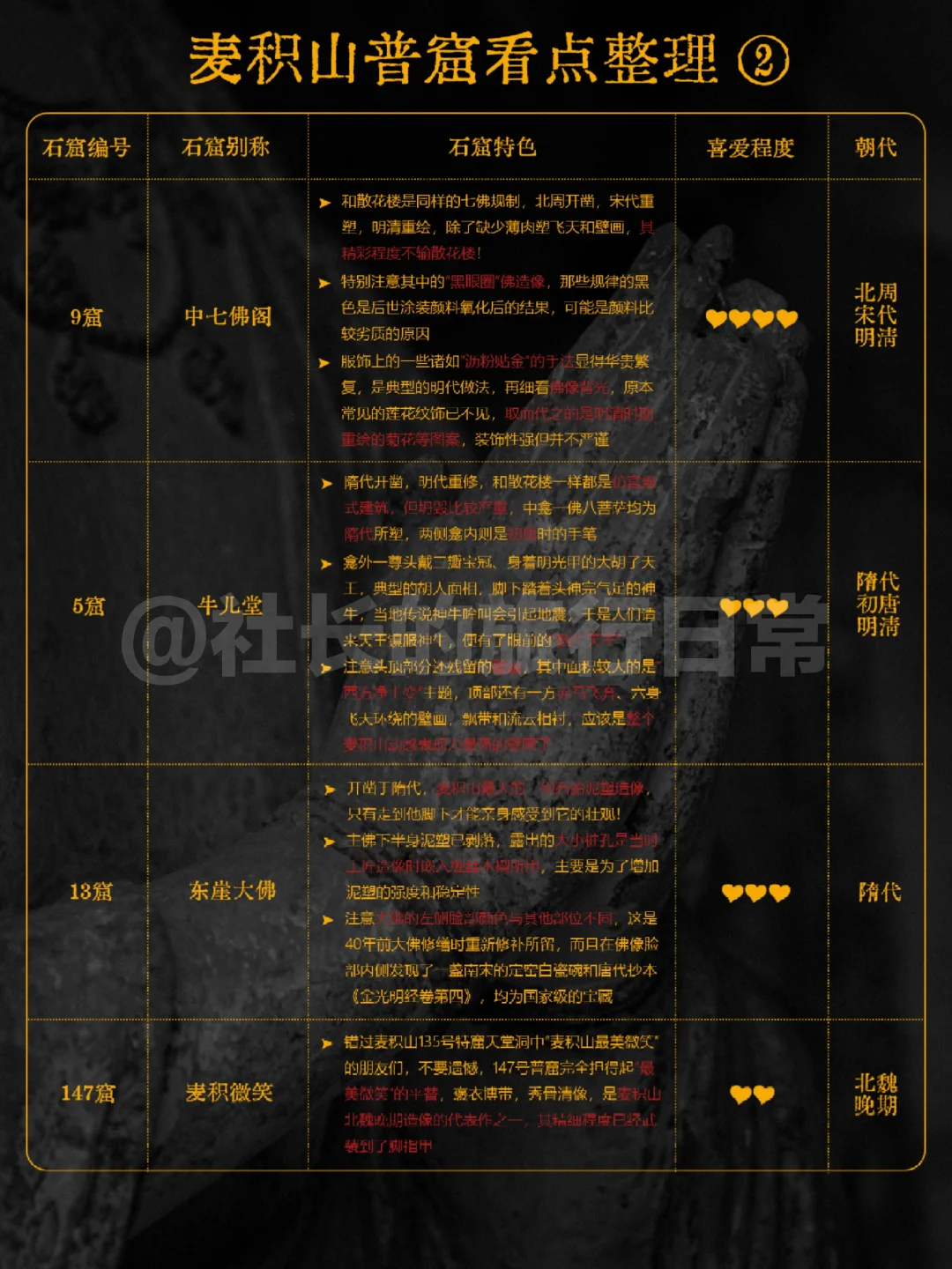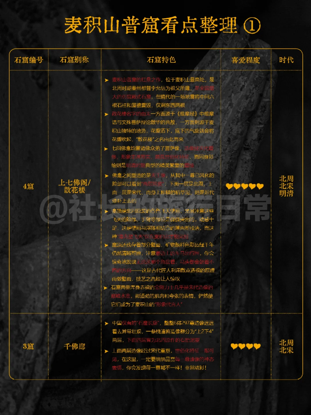 别以为只有特窟才“特别”,麦积山的普窟同样不逊色!淡季的好处是可看洞窟更多,而且可以不再拘泥于“单向通行”,想看多久就看多久,爽!但几百个普窟肯定无法面面俱到,下面社长附上散花楼的一些精彩看点‼️“个人喜爱度排序”及其他窟的详细总结见图2️⃣-4️⃣‼️,如与你意见相左,以你为准🙃