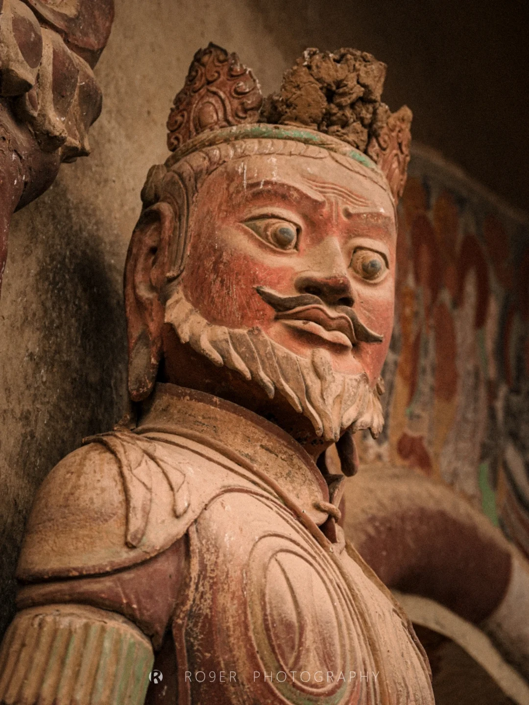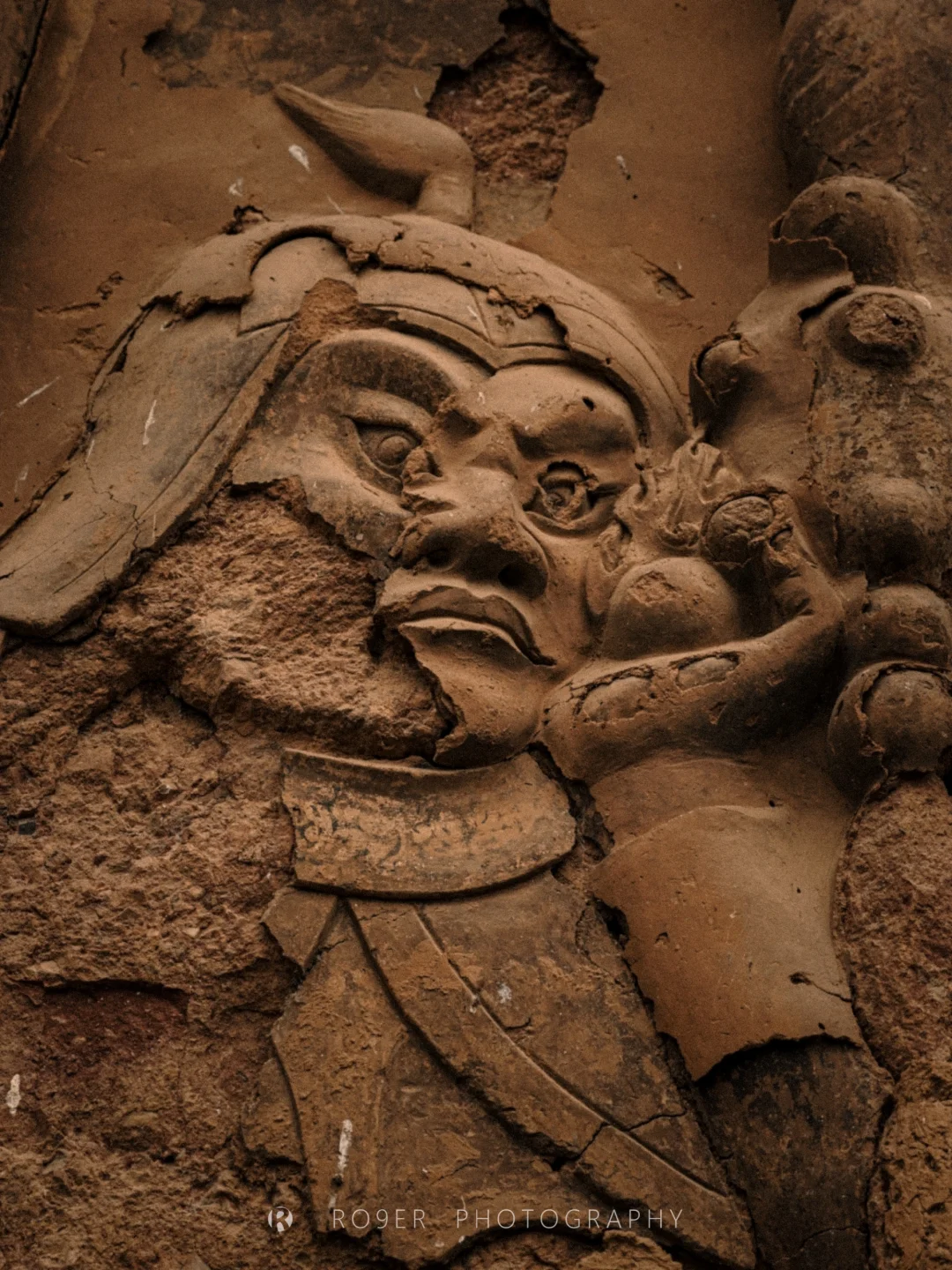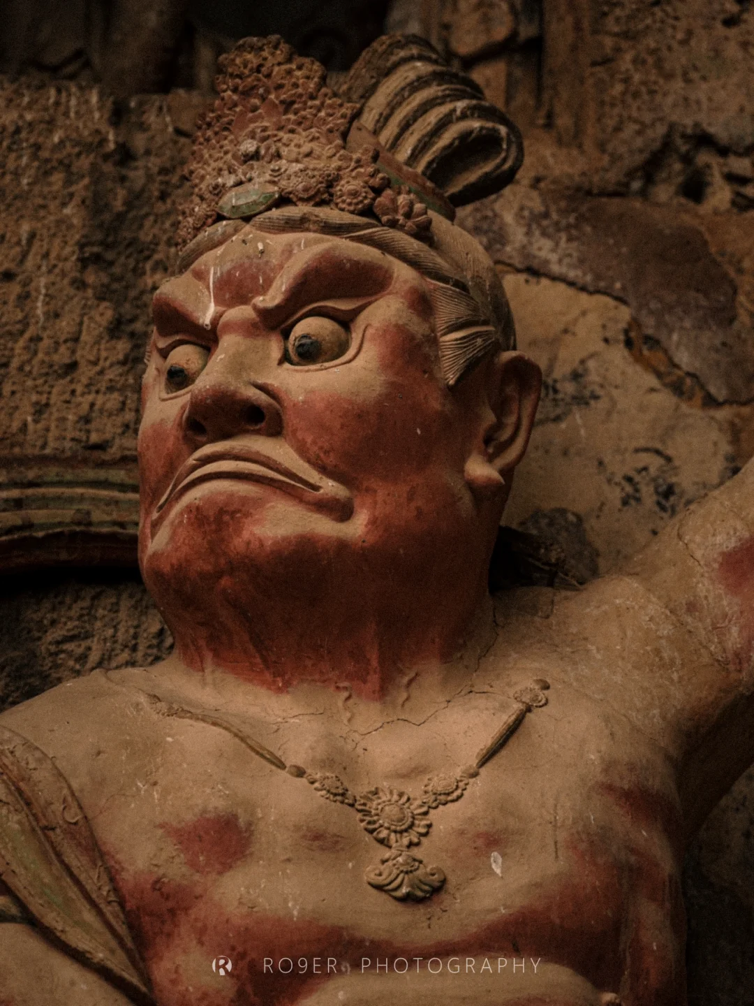 👉佛龛之间造天王像,从其中一尊已风化的脸部可以看到“两层脸皮”:下面一层是北周,上面一层是宋代,而身上粗糙的稻草泥,则是近代修补上去的