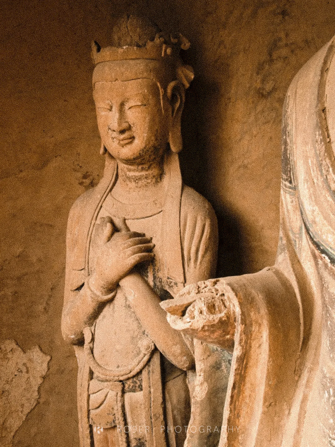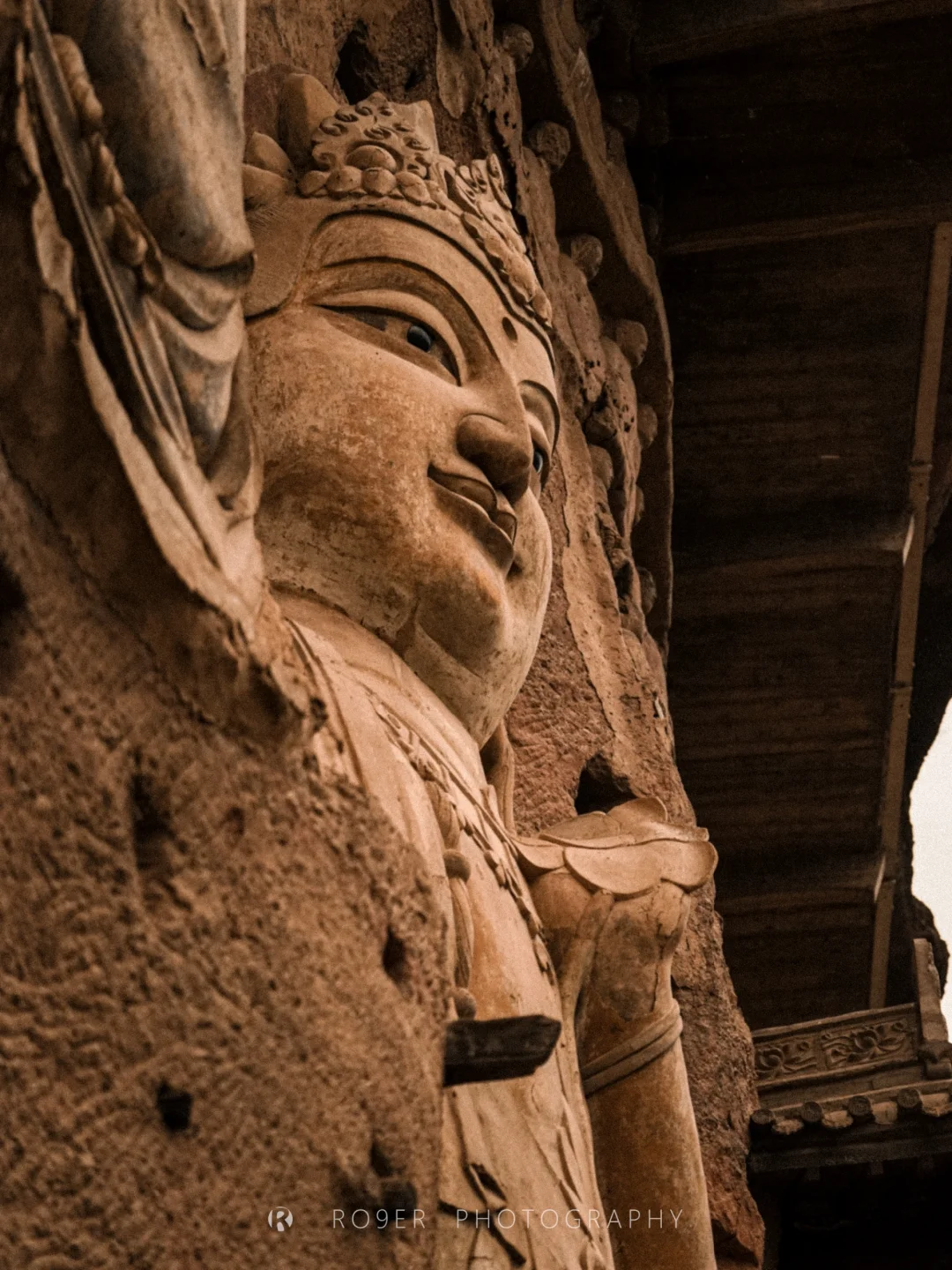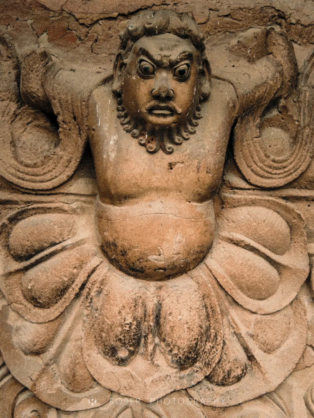 👉佛龛之间造天王像,从其中一尊已风化的脸部可以看到“两层脸皮”:下面一层是北周,上面一层是宋代,而身上粗糙的稻草泥,则是近代修补上去的