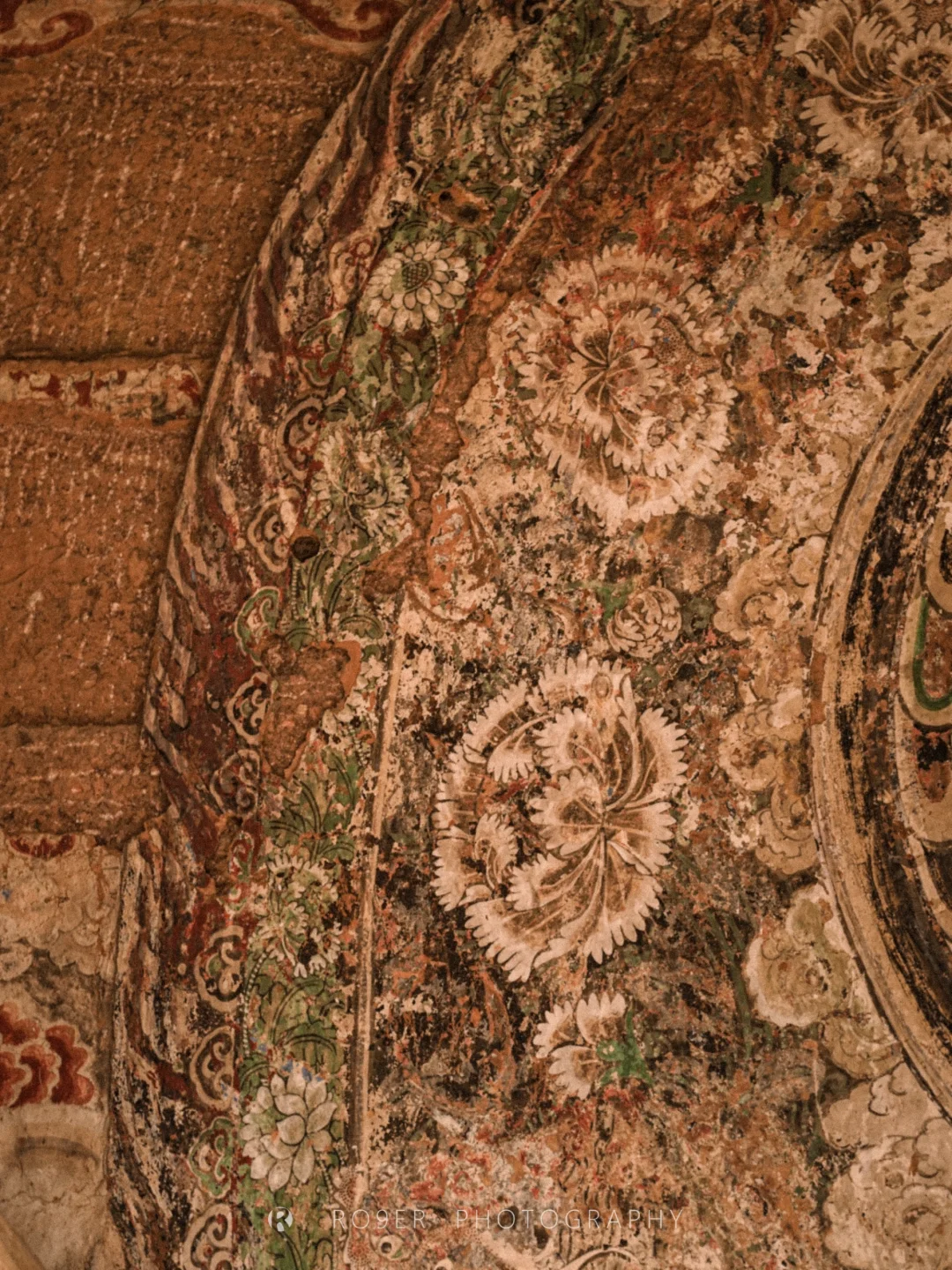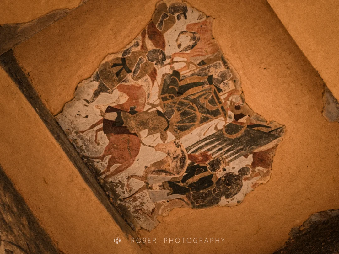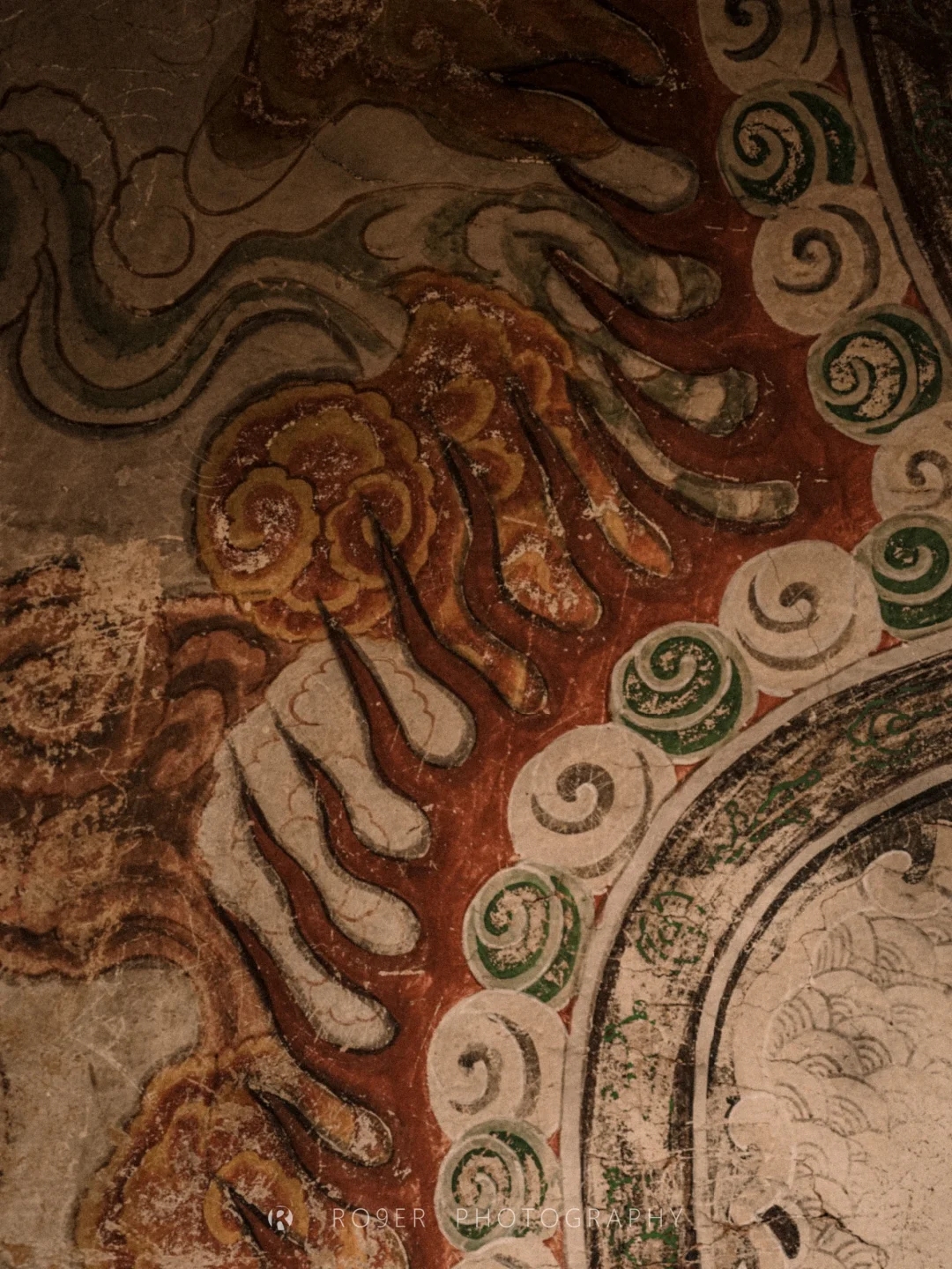 👉窟顶还残存着部分壁画,矿物颜料色彩历经千年仍然清晰可辨,注意最边上的车马出行图,你会惊奇地发现无论从哪个角度看,马头都会朝着不同的方向——这是古代匠人利用散点透视的原理而做壁画,技艺之高超让人惊叹