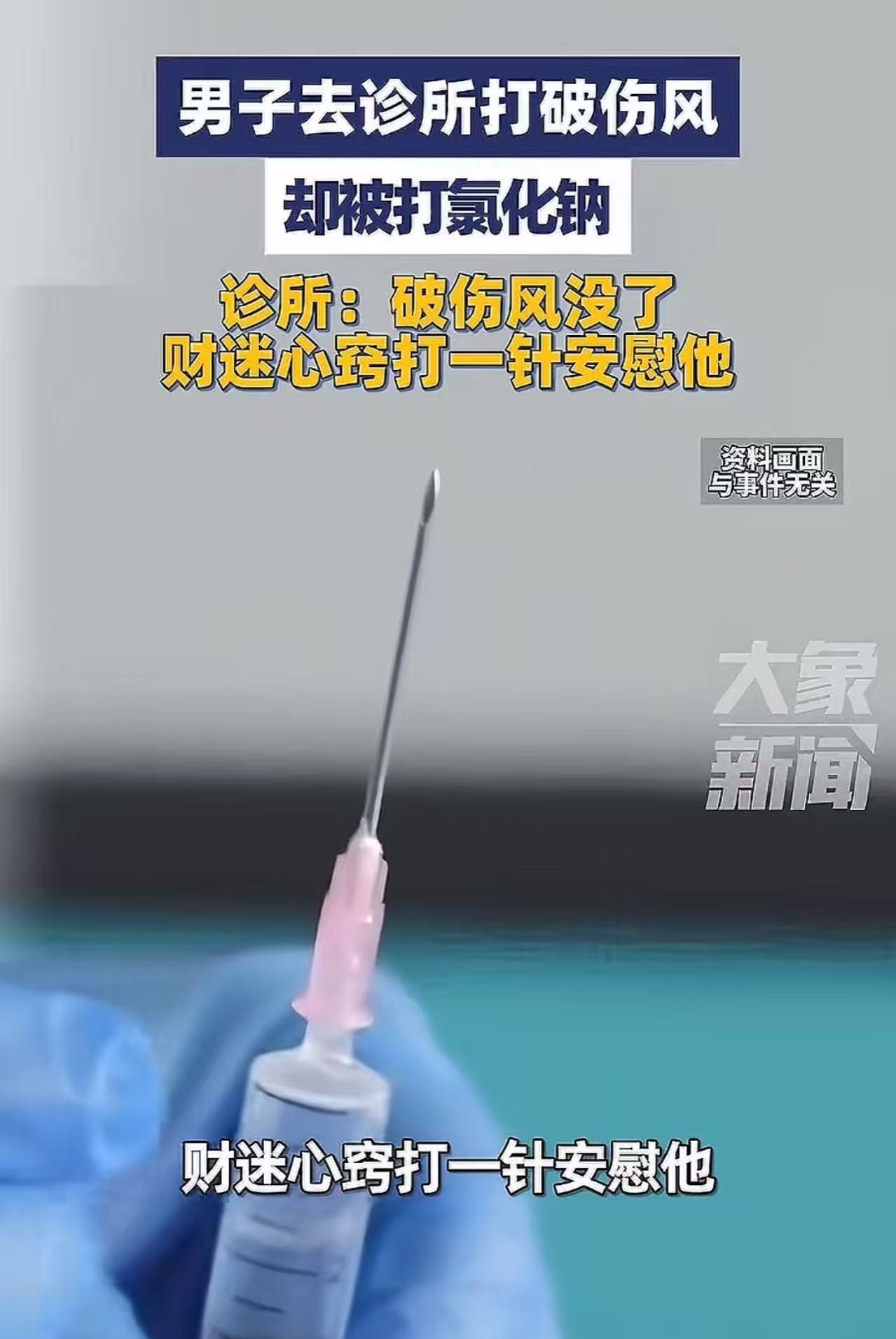 万万没想到!广西桂林,男子去诊所打破伤风,却被打了氯化钠,诊所负责人:“破伤风没了,财迷心窍打一针安慰他!”网友:必须吊销行医执照,心术不正不能行医,如果没有发现,之后人没了怎么办? (来源:齐鲁壹点) 这天,李宁在工地上干活,不小心被一枚生锈的钉子扎伤了脚。伤口虽然不大,但生锈的钉子让李宁心里总觉得不踏实。 毕竟,破伤风可不是闹着玩的,万一感染了,那后果可不堪设想。于是,他顾不上多想,急匆匆地跑到附近一家私人诊所,让医生给自己打一针破伤风。 可就在医生拿起针准备注射的时候,李宁眼尖,一下子就发现不对劲儿了,他压根没看到那支破伤风药。 于是李宁开口质疑:“医生,我这破伤风药呢?你拿出瓶子给我看看?” 面对李宁的质疑,诊所医生却显得有些慌乱,嘴里一直找各种理由辩解。 李宁越听越觉得不对劲儿,选择投诉。之后,在相关部门的严肃询问下,诊所医生终于撑不住了。 他承认诊所里的破伤风药用完了,可他财迷心窍,昧着良心给李宁注射氯化钠。 目前,相关部门已经介入调查,相信很快就会给李宁一个公正的说法。 此事引发了热议,有网友说,这是谋财害命!破伤风不是开玩笑,今年我舅舅就是被生锈铁钉扎脚还流血,但他没当回事,结果人都没救回来! 也有网友说,这新闻给我们一个提醒,去医院打什么针我们自己也要核对。我去医院打过两次破伤风,看着这新闻心里都有点拔凉的!狂犬疫苗和九价疫苗会不会也这样糊弄人? 还有网友说,其实就是用低几率来谋财!因为他知道不打破伤风针而得破伤风的几率大概在几万分之一或十万分之一!所以他赌病人不会是那之一的人!才收了几百一只的破伤风免疫球蛋白的钱换成几分钱的生理盐水! 医生给他打生理盐水敷衍了事,这很可能就会造成病情延误。一旦真的得了破伤风,那可就是严重的医疗事故了,到时候后果不堪设想!