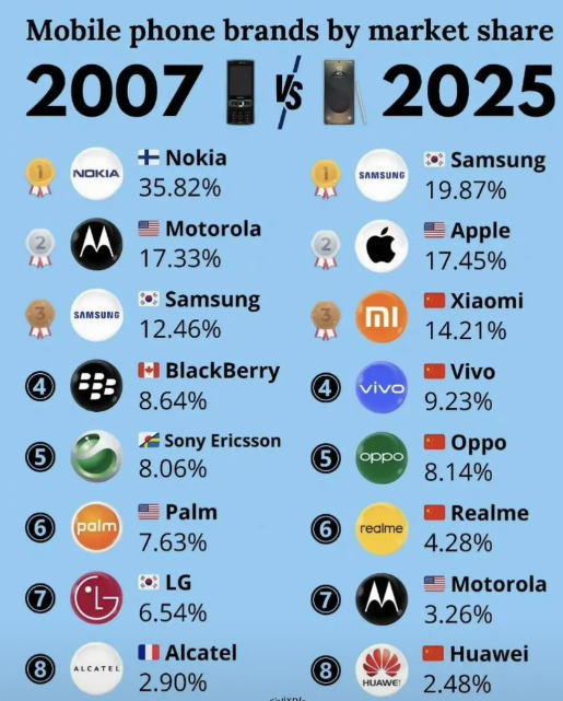 2007年全球手机市场前五是诺基亚、摩托罗拉、三星、黑莓、索尼爱立信,诺基亚份额达到恐怖的35.82%,2025年前五是三星、苹果、小米、vivo、OPPO。