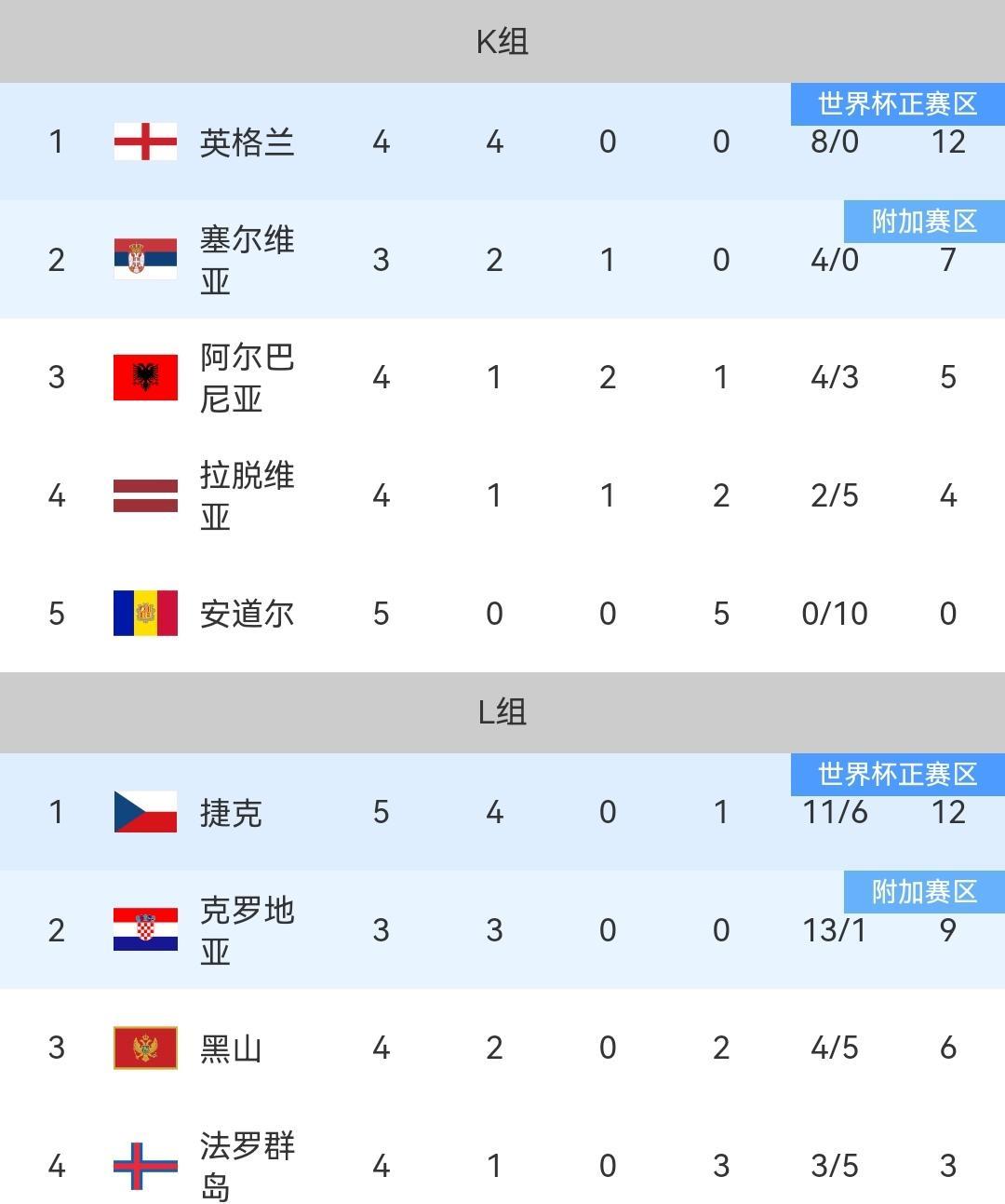 欧洲区预选赛 世预赛欧洲区预选赛今日战罢,首次登场亮相的葡萄牙客场5-0大胜亚美尼亚,英格兰2-0轻取安道尔收获预选赛四连胜领跑积分榜,来看具体赛果和排名! A组爆出本次欧洲区预选赛第一场冷门,斯洛伐克主场两球击败德国,送给德意志战车世预赛客场首败,北爱尔兰3-1卢森堡领跑积分榜! B组瑞士4-0科索沃领跑,瑞典和斯洛文尼亚2-2战平分列二三位。C组希腊5-1大胜白俄罗斯领跑积分榜,丹麦和苏格兰握手言和各取一分! D组冰岛5-0大胜阿塞拜疆,法国2-0乌克兰,两队位居前两名。E组西班牙3-0战胜保加利亚,土耳其3-2力克格鲁吉亚,斗牛士与土耳其下场将直面对决! F组葡萄牙五球横扫亚美尼亚收获开门红,罗哥首发出战贡献两粒进球,匈牙利和爱尔兰1-1战平!G组荷兰1-1战平波兰,荷兰少赛一场和波兰、芬兰同积7分! H组波黑6-0大胜圣马力诺迎来四连胜领跑积分榜,奥地利1-0塞浦路斯同样一波三连胜,少赛一场落后波黑三分。I组意大利5-0爱沙尼亚迎来世预赛的两连胜,少赛一场落后榜首的挪威6分! J组比利时6-0大胜列支敦士登,少赛两场落后榜首的威尔士三分。K组英格兰轻取安道尔四连胜领跑积分榜,塞尔维亚少赛一场落后英格兰5分! L组克罗地亚1-0法罗群岛迎来三连胜,少赛两场落后榜首的捷克3分!