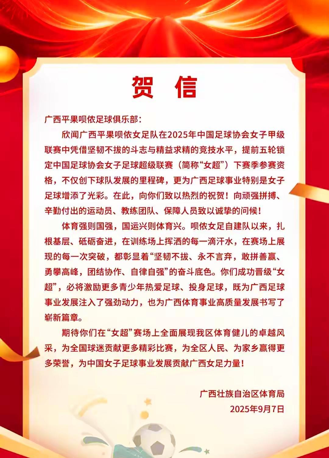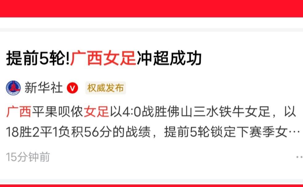 广西女足提前五轮冲超成功,2026赛季的女超绿茵场,一支年轻的新军横空出世,四年磨一剑,霜刃未曾试,接下来的中国女足顶级联赛必将更加精彩纷呈。 在广西女足冲超成功的第一时间,广西壮族自治区体育局发来了贺信,新华社也给予了全面报道,是的,这是广西有史以来第一次拥有了自己的顶级联赛队伍,全体广西女足将士是整个广西的骄傲。 祝贺广西平果,作为一个常住人口只有45万的县级市,培养出一支女足顶级联赛队伍非常不易。 而她们却做到了,她们用行动证明了小县市也可以在足球版图上画出最光彩夺目的圆。 期待广西女足2026赛季的女超风采,下一个赛季的青春风暴一定属于年轻的广西女足,加油!
