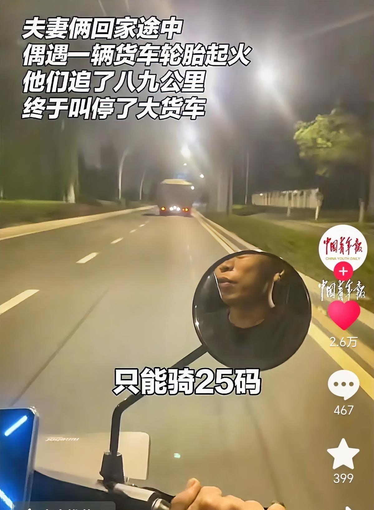 这救的哪里是一个人,分明是一个家庭呀! 9月6日湖北宜昌,一对夫妻晚上骑着小电驴回家,在路上看到一辆货车,发现货车的轮胎着火了,司机似乎没有察觉,还一路向前开。 夫妻俩十分着急,这可不是开玩笑的,一旦火势变大了,可能会发生爆炸。夫妻俩大声喊叫,奈何两车的距离有点远,货车司机听不到,夫妻俩就开始加速去追大货车。 但是小电驴最快只能骑25码,很难赶上大货车,夫妻俩一边追一边喊,还一直嘀喇叭,追了八九公里,总算把大货车叫停了,赶紧告诉货车司机,轮子着火了。 司机大哥也吓了一跳,赶紧从车上拿了灭火器来灭火,幸好发现的及时,没有造成什么损失。 骑着小电驴的大哥被老婆夸“英雄救火”,嘴巴高兴的翘起来了,面对货车司机的感谢,这夫妻俩说不管谁看到了都会提醒的,真是谦逊又善良。 有网友说,轮子着火真的挺危险的,车上还一堆货物,一旦火势变大,后果不堪设想,这夫妻俩救的哪里是一个人啊,分明是一个家庭啊! 是啊,莫以善小而不为,有时候我们的小小举动,也会救人于水火之中。 (信息来源:中国青年报)