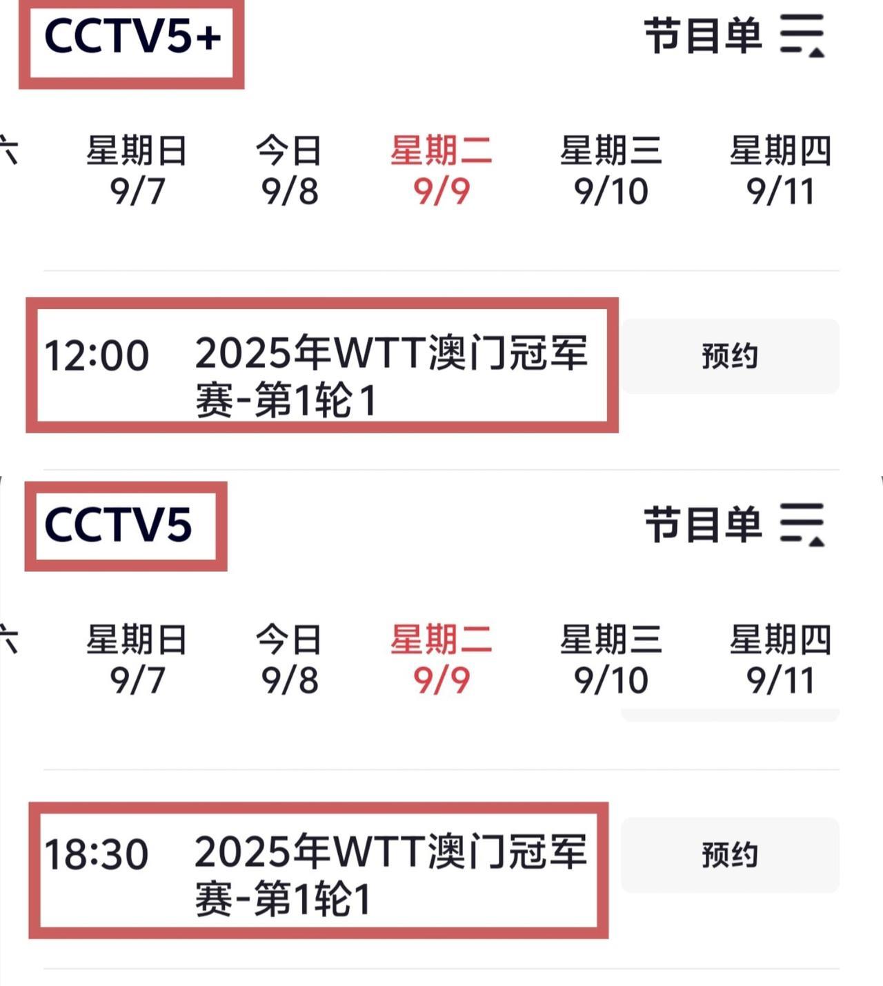 澳门冠军赛:9月9日赛程王楚钦首轮对阵松岛辉空 央视全程直播 WTT澳门冠军赛将于2025年9月9日至14日在澳门东亚运动会体育馆举行,赛事设男女单打两个项目。国乒11人参赛(梁靖崑退赛),男队:林诗栋、王楚钦、黄友政、向鹏、陈垣宇;女队:孙颖莎、王曼昱、陈幸同、蒯曼、王艺迪、陈熠。 9月9日首轮安排有12场,其中国乒有4场,具体对阵及时间如下: 12:45 男单1/16决赛 13:20 女单1/16决赛 15:05 男单1/16决赛 20:50 男单1/16决赛 CCTV5+体育赛事频道12:00开始直播、CCTV5体育频道18:30开始直播。