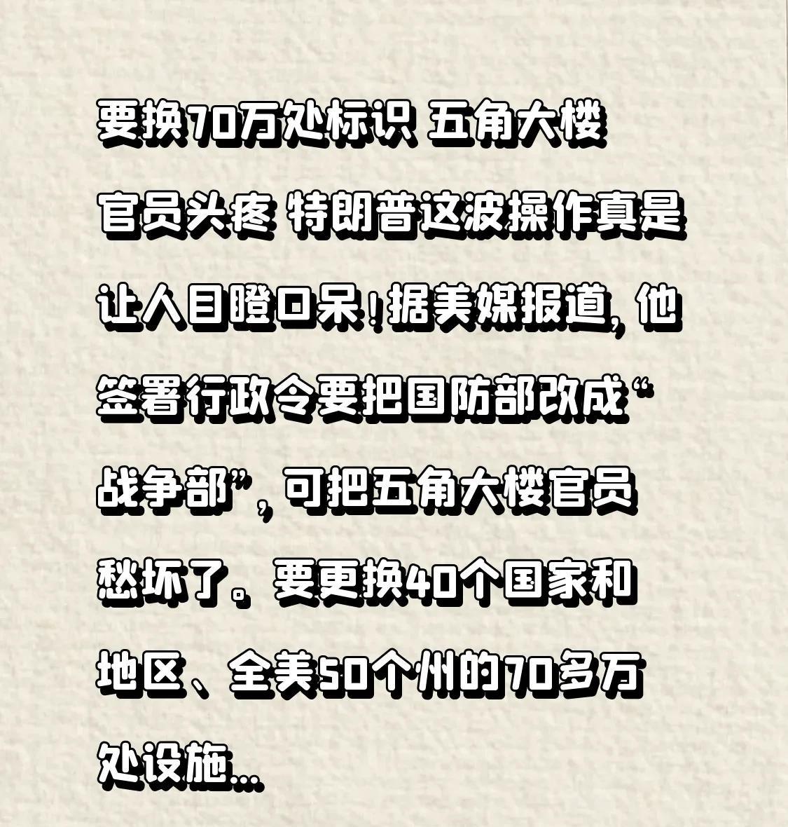 要换70万处标识 五角大楼官员头疼 70万处标识待更换,五角大楼官员愁眉不展,特朗普这波操作着实令人瞠目结舌!据美媒报道,他签署行政令,要将国防部改为“战争部”,可把五角大楼官员给难住了。这意味着要更换40个国家和地区以及全美50个州的70多万处设施标识,从信笺抬头到小饰品,事无巨细都得改。这得消耗多少时间、精力和金钱啊! 有前国防官员称这是演给国内政治观众看,此言不虚。民主党人也指出,他一边想着改国防部名称,一边觊觎诺贝尔和平奖、承诺结束战争,实在讽刺。此前他还把墨西哥湾改成美国湾,这是要搞大动作还是纯粹好大喜功呢?反正苦了五角大楼官员,数不清的小麻烦正等着他们去解决。 #五角大楼白宫# #五角大楼重组# #美国五角大楼#