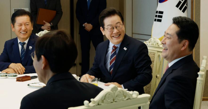 李在明与朝野两大党党首郑清来、张东赫见面。谈话握手,共进午餐。 时间是9月8日中午。 地点:首尔龙山总统府。 李在明与执政党共同民主党党首郑清来、最大在野党国民力量党首张东赫举行午餐会。 李在明表示:我将尽可能听取在野党党首和在野阵营的意见,以及所传达的民声。