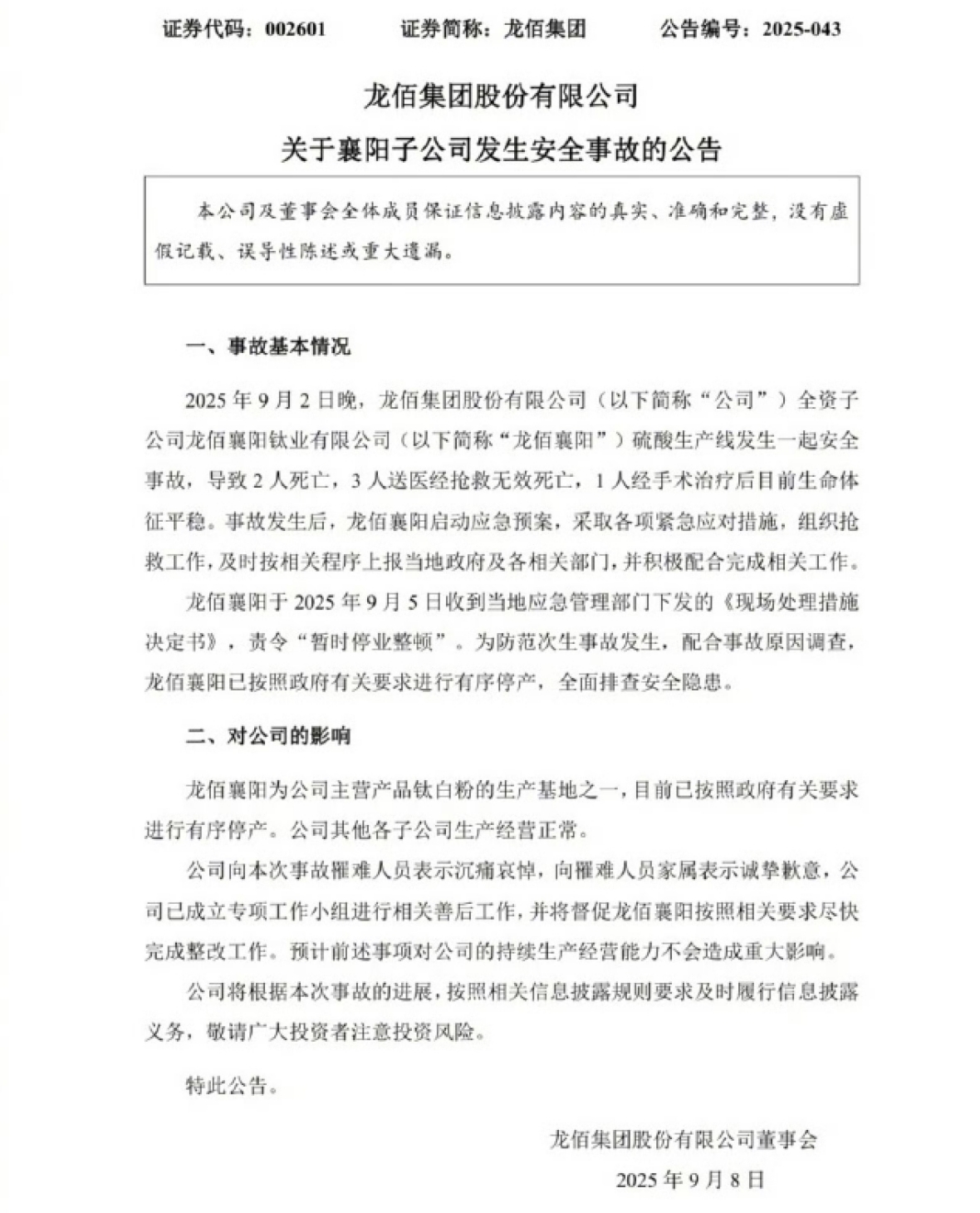 龙佰集团襄阳子公司硫酸生产线出重大事故,5死1伤令人痛惜 龙佰集团旗下襄阳子公司的硫酸生产线早前发生了重大安全事故,造成5人死亡、1人受伤。 事情发生在9月2号晚上,龙佰集团的全资子公司龙佰襄阳钛业有限公司他们的硫酸生产线突然出了意外。 根据集团9月8号晚上发布的公告,事故当场就夺走了2个人的生命,另外3名伤者被送去医院抢救但是没能救回来,还有1人经过手术治疗后目前生命体征平稳。 事故发生后,龙佰襄阳立刻启动了应急预案,一边组织抢救,一边向当地政府及相关部门上报情况。到了9月5号,当地应急管理部门向他们下发了《现场处理措施决定书》,责令“暂时停业整顿”。为了防止发生次生事故也为了配合调查,龙佰襄阳已经按照政府要求全面停产,还在彻底排查安全隐患。 可能有网友不清楚这家公司的背景,龙佰襄阳是龙佰集团主营产品钛白粉的重要生产基地,总部位于河南焦作,它是大型新材料研发制造集团,钛白粉和海绵钛的产能还位居全球第一。不过集团公告里说,其他子公司的生产经营都正常,还预计这次事故不会对公司持续生产经营能力造成重大影响。 龙佰集团在公告中也向事故遇难人员表达了沉痛哀悼,向他们的家属致以诚挚歉意。目前集团已经成立专项工作小组处理善后事宜,还督促龙佰襄阳尽快完成整改。 硫酸生产本身就涉及危险化学品,过去也发生过类似意外,比如尾气吸收设备里的碱液没及时更换,结果导致二氧化硫泄漏。 这些案例一次又一次提醒所有企业,安全生产才是真正的生命线。一定要严格落实安全管理制度,加强员工培训,及时排查设备隐患,绝对不能有半分松懈和侥幸心理,因为一旦出纰漏,可能就是人命的代价。 工业生产要发展,但安全绝对不能丢在脑后。希望这次事故能让所有企业引以为戒,别再让这样的悲剧重演。
