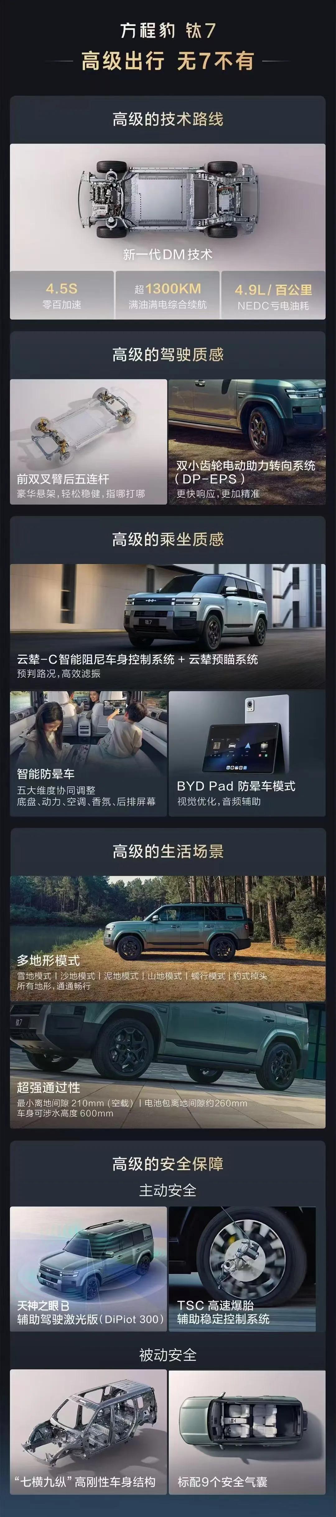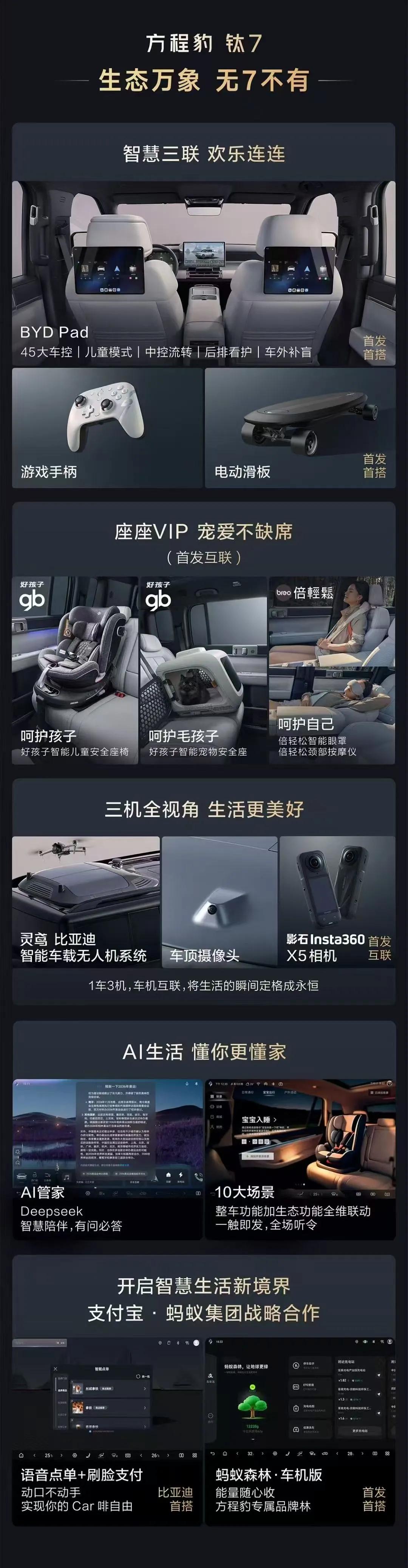 【比亚迪“大五座天花板”方程豹钛7火爆上市】安全立本万事顺稳。刚刚亮相的钛7新车标配天神之眼智能辅助驾驶,拥有越级的TSC高速爆胎辅助稳定控制系统;采用“七横九纵”的高刚性车身结构,全车装配9个安全气囊,让出行有底气,让驾驶更安心。首发搭载一块真正为车载和家用双向考虑的智能平板,不仅能控制车内多项功能,还兼容主流平板,前排背后支架稳固又支持充电。更配有自研电动滑板和游戏手柄,让全家出行趣味满满。