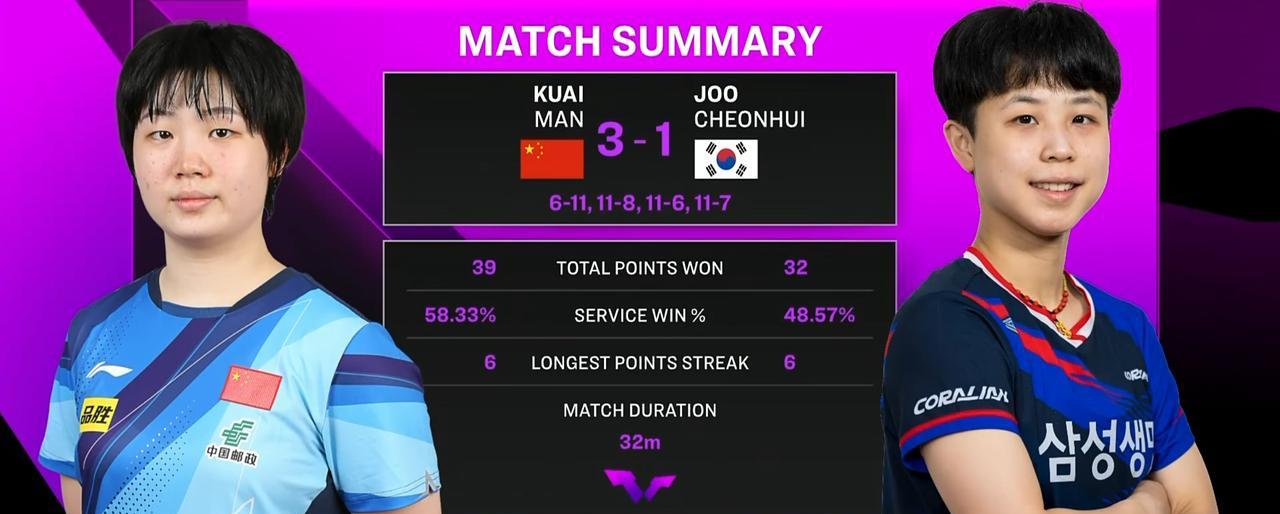 蒯曼逆转朱芊曦晋级WTT冠军赛澳门站丨女单16强! WTT冠军赛澳门站丨女单1/16决赛 本场比赛首局,朱芊曦凭借主动进攻和正手压制,以11-6先下一城,蒯曼开局慢热且失误偏多。 第二局蒯曼4-9落后时,教练暂停指导,强调提速和正手强攻,限制朱芊曦的抢攻节奏,迫使对手失误率上升,最终以11-8逆转扳平比分。 第三、四局蒯曼彻底释放正手火力,通过落点控制和相持变线压制朱芊曦反手,连续以11-6、11-7取胜。 蒯曼逆转朱芊曦晋级女单16强,目标女单冠军!