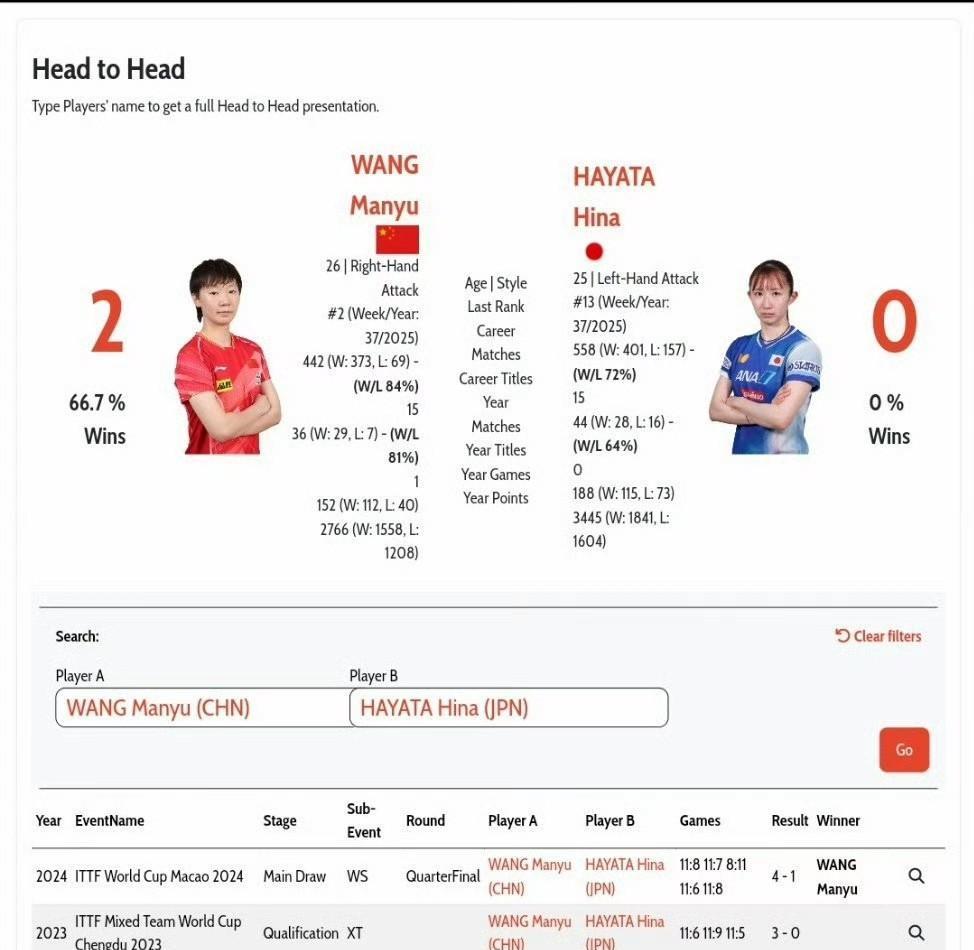 王曼昱和早田希娜迎来第三次交手。 今天的女单比赛中,早田希娜3比0黄怡桦,晋级女单16强,下一轮女单1/8决赛,早田希娜将对阵国乒主力王曼昱。郑怡静因伤退赛,所以今晚最后一场比赛没有打,王曼昱是直接晋级的16强,刚刚看了一下王曼昱和早田的交手记录,在国际赛场上两个人只有过2次交手,王曼昱全胜,最近一次交手是在2024澳门世界杯。 这次又是在澳门,两个人相遇了,王曼昱直接晋级比赛,就少一轮适应场地的时间。刚刚看到日媒发文,早田希娜说:“我在比赛中给自己设置了课题并去实践,很期待下一轮对阵王曼昱,她是那种一旦自己出现了简单失误就赢不了的选手,明天我要带着高度的意识去投入训练,比赛全力以赴。”时隔一年俩人再次相遇,早田希娜看起来准备很充分,不过这次王曼昱的状态也很好,相信一定可以赢的。 目前国乒女队孙颖莎、王曼昱、王艺迪、陈幸同、蒯曼已经晋级女单16强,明天上午有陈熠的比赛,陈熠首轮对阵金娜英,陈熠加油哦!