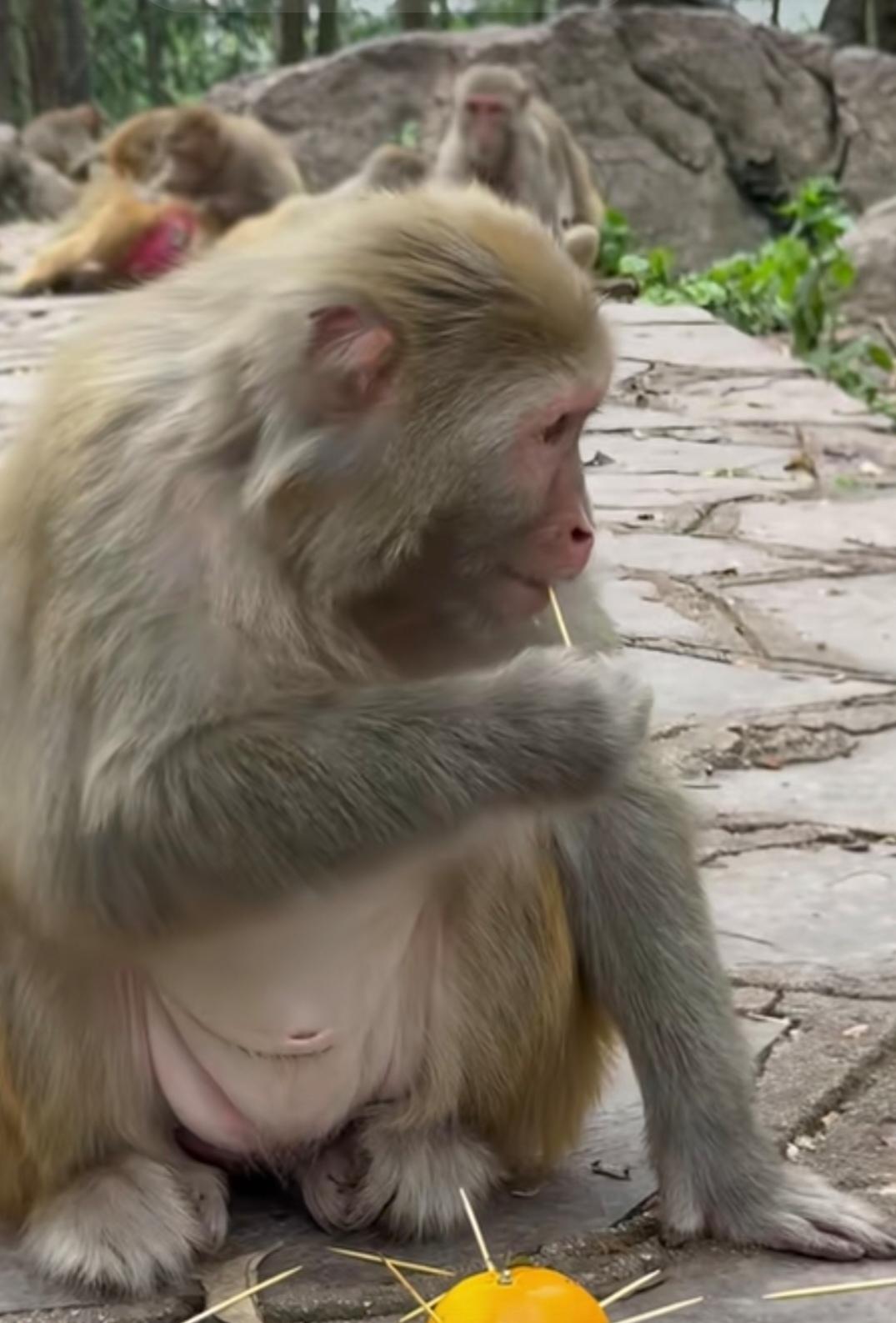 在景区里,一名游客对猴子做恶作剧,他拿出一个橙子,然后在橙子上面插满了牙签,放到地上给猴子吃。 一个小猴子看到了,看着浑身长满刺的橙子想拿又不敢拿,旁边有个大猴子看到了,先是试探着用爪子,拔掉橙子上面几个牙签,然后就抓起橙子,想用嘴啃,但感觉边上的牙签碍事,聪明的猴子又用爪子拔掉了几颗牙签,终于可以开吃了。