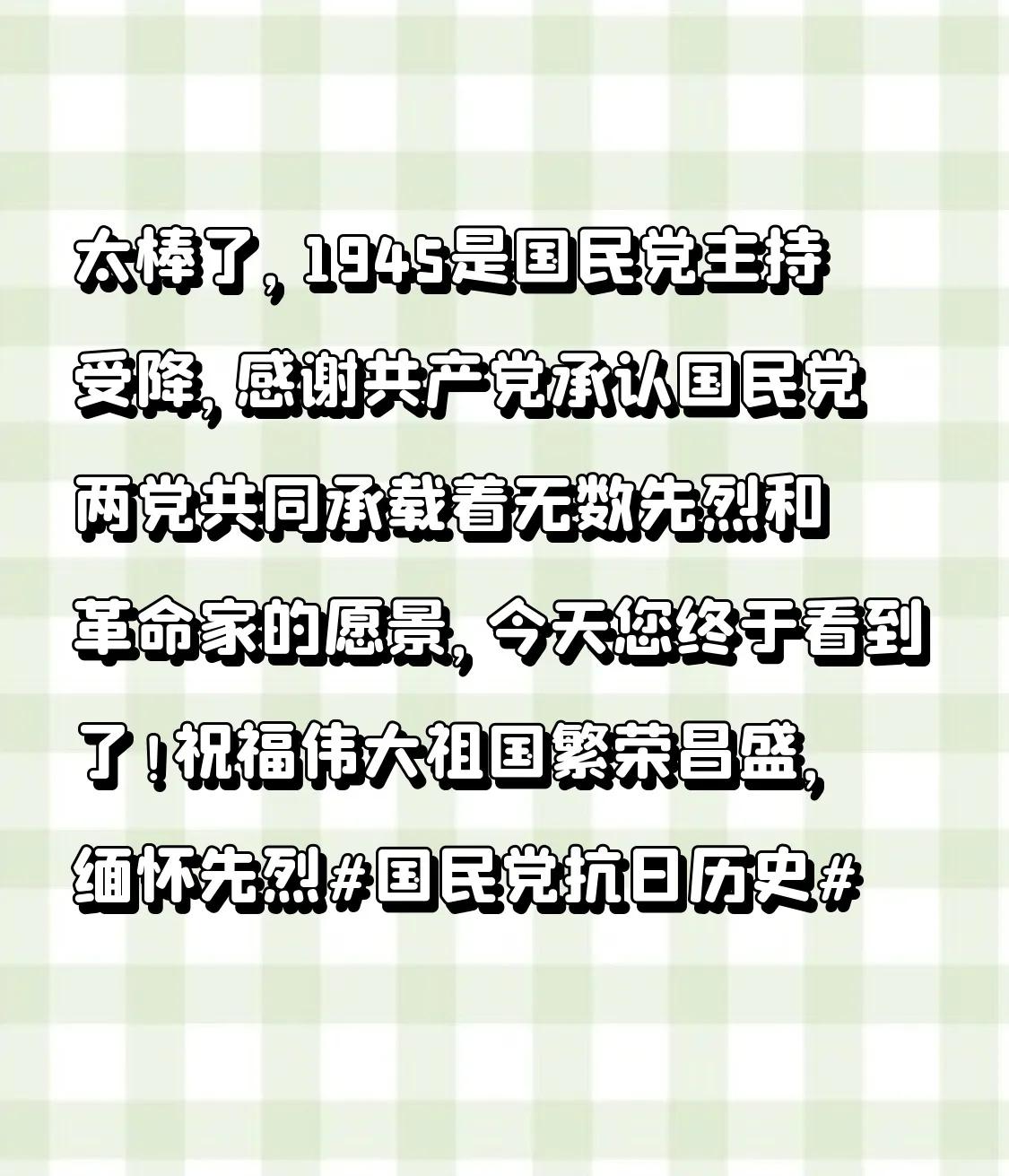 太棒了,1945是国民党主持受降,感谢共产党承认国民党[比心][比心][比心]两党共同承载着无数先烈和革命家的愿景,今天您终于看到了!祝福伟大祖国繁荣昌盛,缅怀先烈[比心][比心][比心]国民党抗日历史 抗日战争的胜利是全体中华儿女浴血奋战、不屈不挠抗争的结果,中国共产党是全民族抗战的中流砥柱。在抗战中,中国共产党最早高举全民族抗战旗帜,最早组织东北抗日游击战争,以局部抗战揭开世界反法西斯战争的序幕;积极倡导、诚心维护抗日民族统一战线,凝聚了中华民族的抗日力量;提出全面抗战路线、持久战战略总方针、游击战争的战略战术,为全民族抗战指引了胜利方向;开辟广大敌后战场,建立巩固抗日根据地,成为坚持抗战的中坚力量;以自我牺牲精神,为抗战胜利作出巨大贡献。