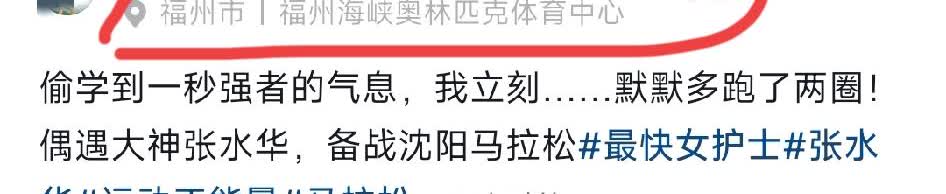 有人在福州海峡奥林匹克体育中心偶遇张护士,说她正在备战沈阳马拉松。 果然强者从不抱怨环境,不管工作多么辛苦,在备受瞩目的档口还能出来训练,为下一场大赛做准备,内心还是很强大的。 她站在中间,周边围一圈跑友,似乎都在为她打气,齐声喊“沈阳马拉松,加油!耶!” 合声中听不到张护士的声音,但她做出了加油的手势。 沈阳跑马,看来她又势在必得了! 沈阳的记者们得好好准备准备了,看能不能这次再采访出一个大热帖出来!