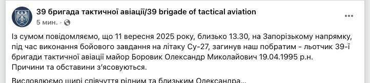 据媒体报道,乌克兰空军第39战术航空旅官宣该部队的一架苏-27战斗机于今天中午在扎波罗热州坠毁,飞行员奥列克桑德尔·米科拉约维奇·博罗维克少校(出生于1995年4月19日)阵亡,坠机原因尚不清楚。 #俄乌局势新进展#