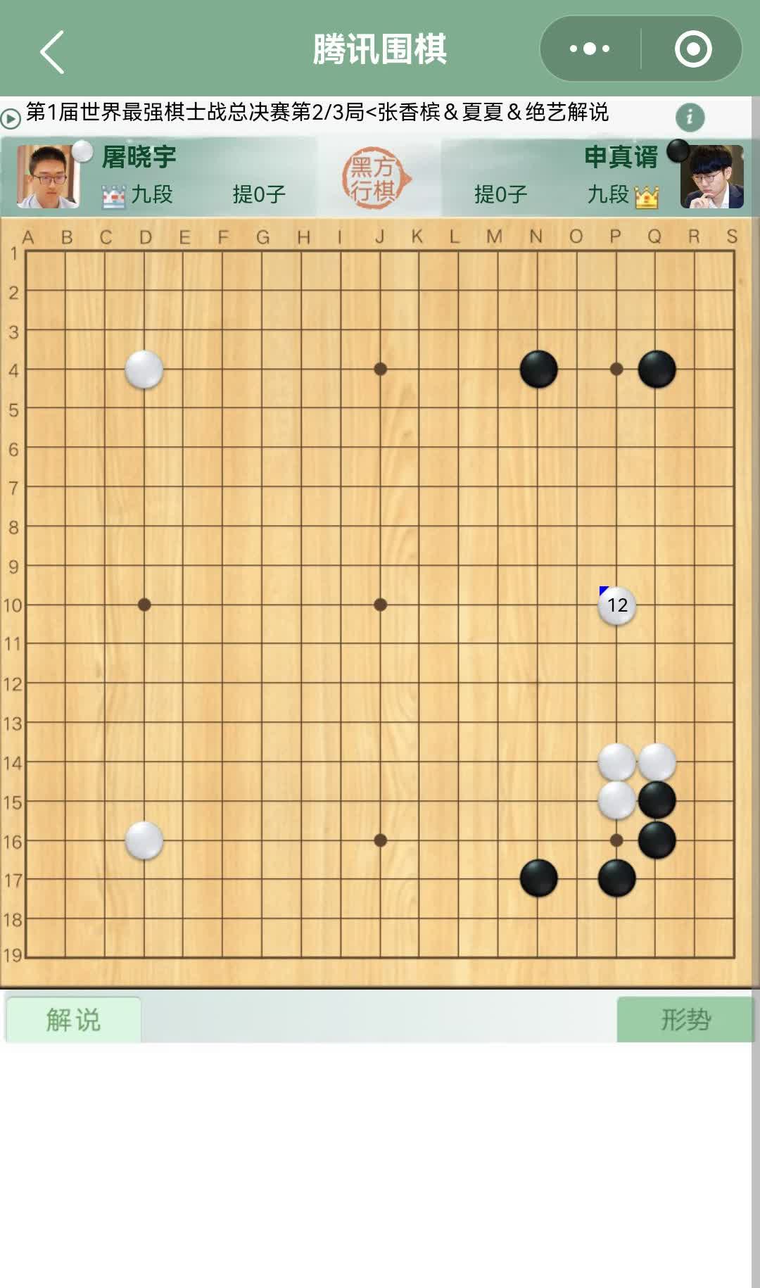 今天2025年9月11日屠晓宇九段与韩国棋手申真谞九段争夺世界围棋最强棋士战第二局比赛正在进行,由韩国棋手申真谞九段执黑先行。 屠晓宇九段有惊无险地执黑以半目优势赢得首局比赛,韩国棋坛一片哗然,尤其是韩国棋迷们的玻璃心碎了一地。 屠晓宇九段目前等级分在中国也只排第12位。柯洁九段夺得首个世界围棋冠军2015年他才入段,而今年屠晓宇九段在世界围棋最强棋士战上已两胜柯洁九段的苦手申真谞九段。 本局执黑的申真谞九段以错小目开局,屠晓宇九段应以二连星。 右下角双方走了过去最常见的托退定式。左下角和左上角黑棋都点了三三 ,申真谞九段想把实地先牢牢把握住。 屠晓宇九段 白30长后,申真谞九段陷入长考。 屠晓宇九段相对于小自己三个月的王星昊九段,面对强敌申真谞九段心不怵,手不软,更有胜负师气质。 相对年长自己的丁浩九段更加全天候,更加不受“空气冷暖“影响。 雄关漫道真如铁,而今迈步从头越!我们坚信屠晓宇九段本届一定将申真谞九段从申工智能的神坛彻底拿下 ,围棋最强在华夏!棋友们我们共同为晓宇加油呐喊!胜利属于我们!