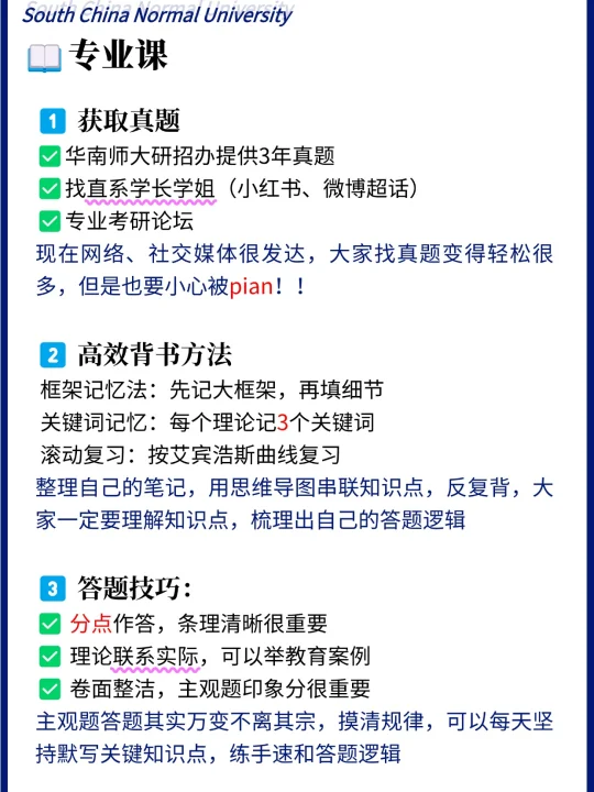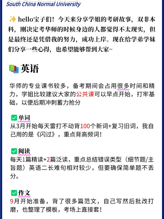 华师的专业课书较多,备考期间会占用很多时间和精力,学姐比较建议大家的公共课可以早点开始[萌萌哒R]。