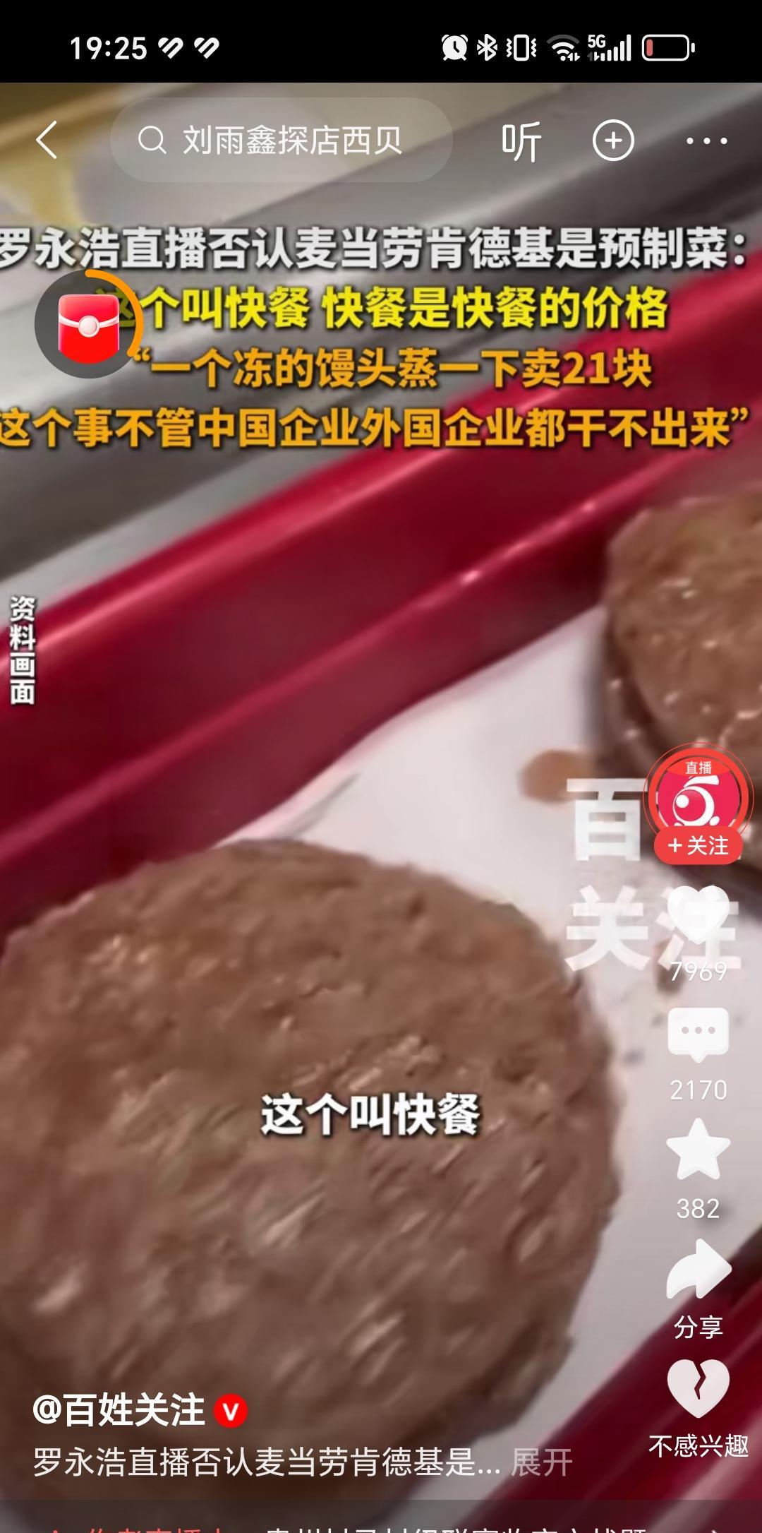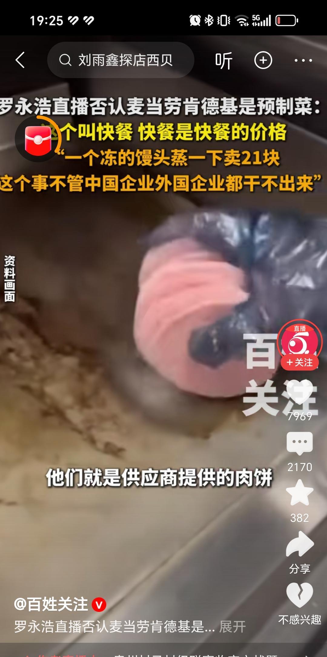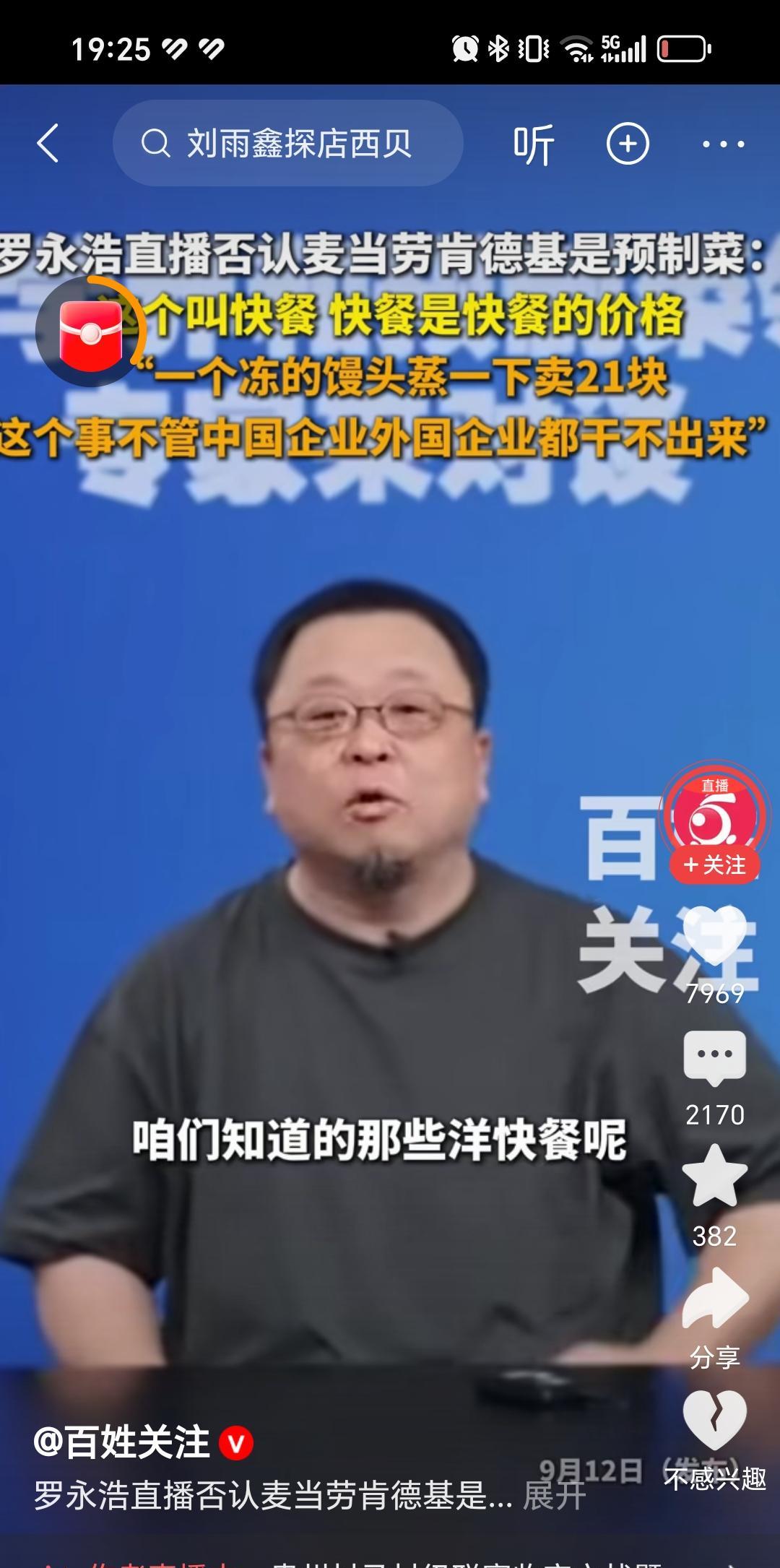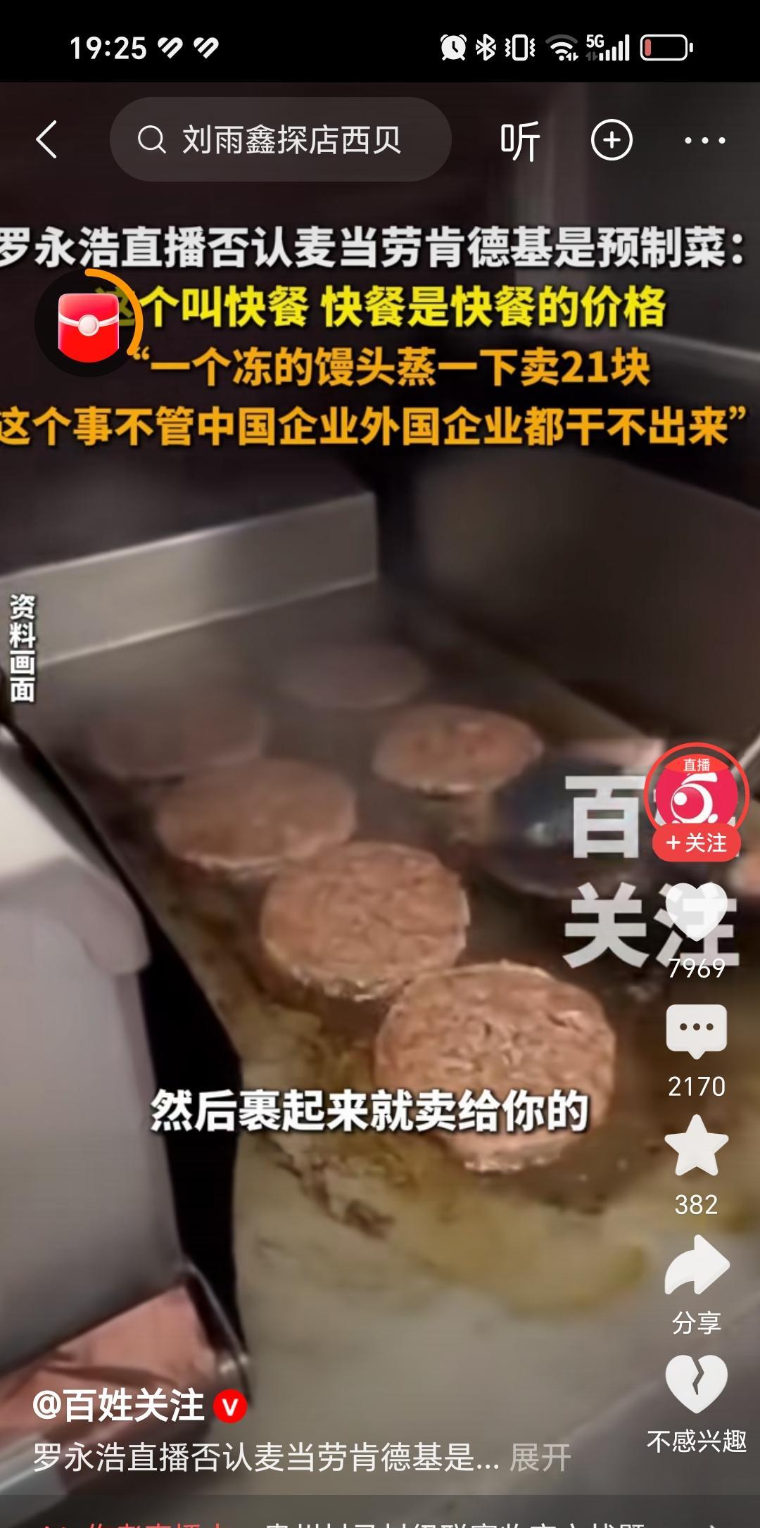 罗永浩直播真的给了现在年轻人当头一棒,别以为大饭店就都是现炒现卖的。看看第一次知道西兰花还能24个月保质期我真的开眼了,我以为西兰花得超市当天买新鲜的,还有麦当劳快餐就是便宜不属于预制菜,因为他得煎熟。 现在很多年轻人吃外卖,吃的很多预制菜,但是大饭店还有我就不理解。一个冻馒头就21元,超市看着现蒸的不就2—3元一斤吗? 我感觉我是小县城的,我都是自己做饭感觉外面不干净,调料多。但是预制菜我接受不了,是不是有个微波炉和电磁炉就能开个饭店,太骗人了。