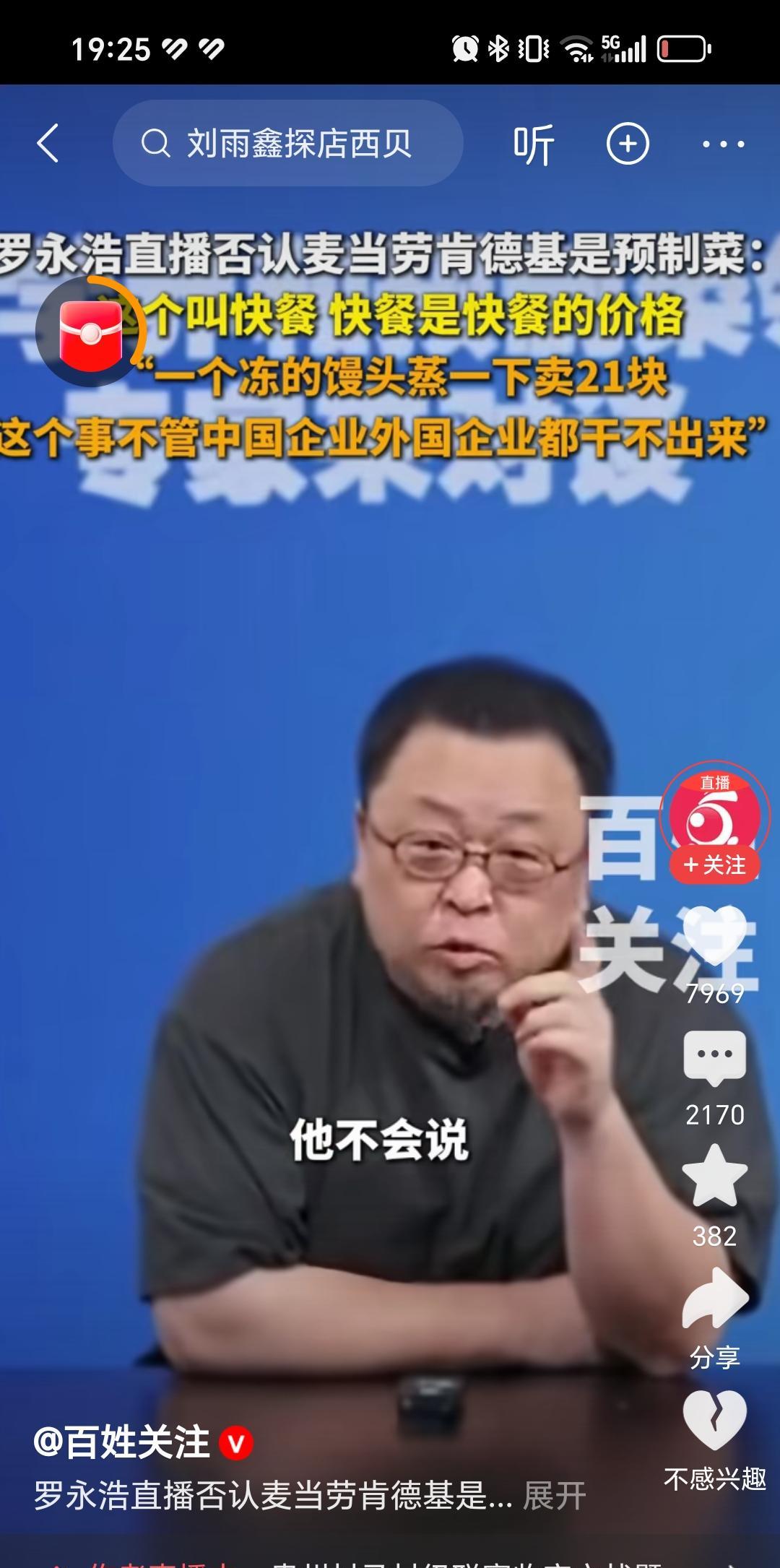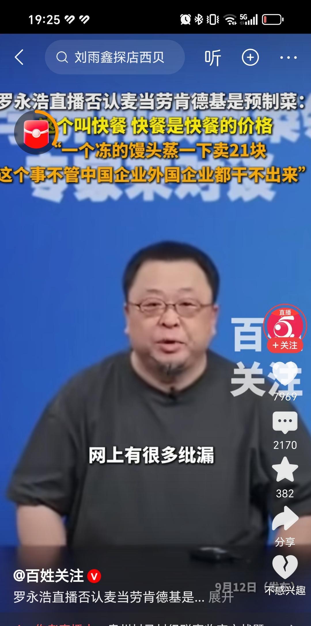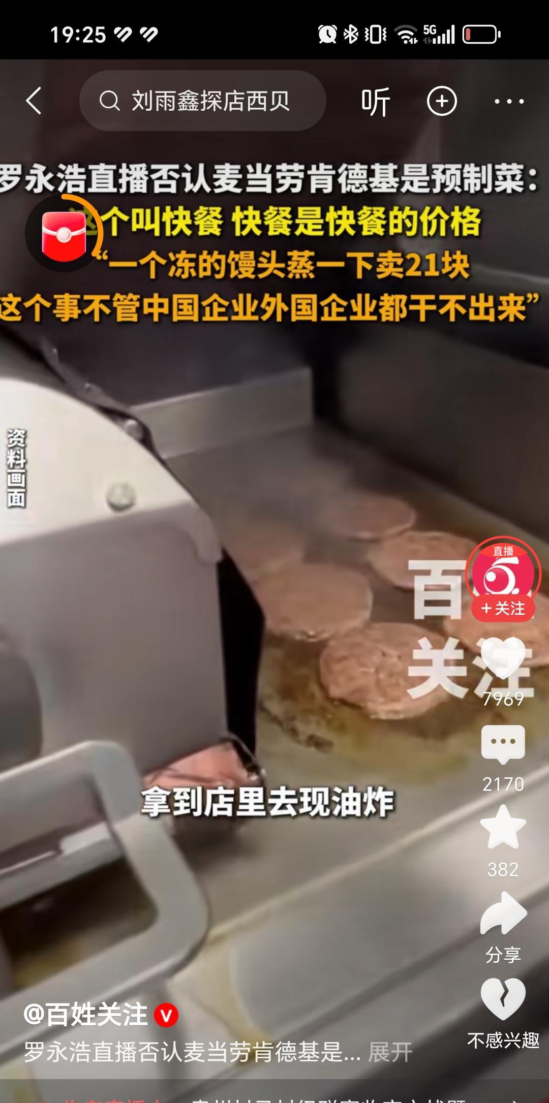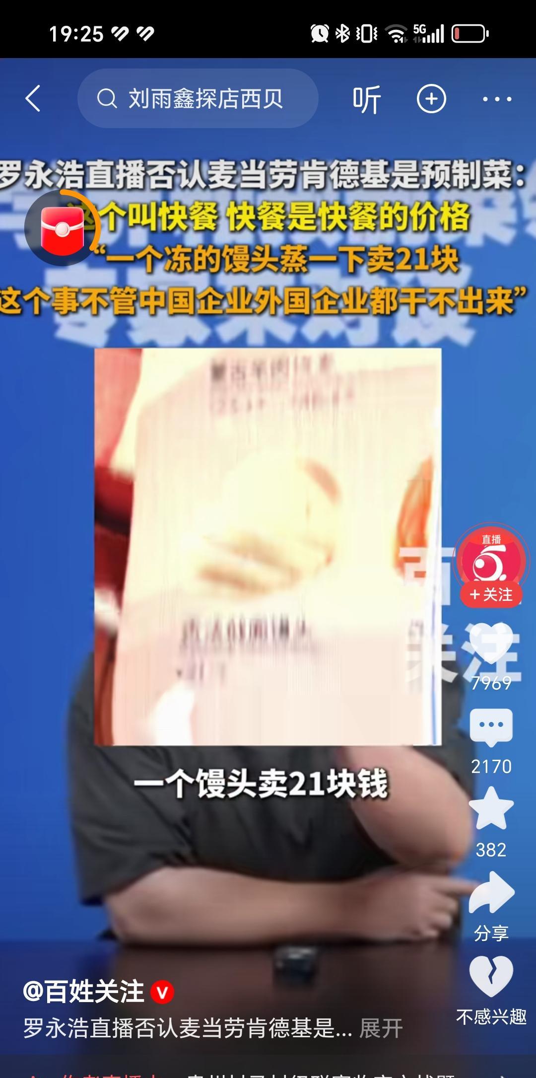 罗永浩直播真的给了现在年轻人当头一棒,别以为大饭店就都是现炒现卖的。看看第一次知道西兰花还能24个月保质期我真的开眼了,我以为西兰花得超市当天买新鲜的,还有麦当劳快餐就是便宜不属于预制菜,因为他得煎熟。 现在很多年轻人吃外卖,吃的很多预制菜,但是大饭店还有我就不理解。一个冻馒头就21元,超市看着现蒸的不就2—3元一斤吗? 我感觉我是小县城的,我都是自己做饭感觉外面不干净,调料多。但是预制菜我接受不了,是不是有个微波炉和电磁炉就能开个饭店,太骗人了。