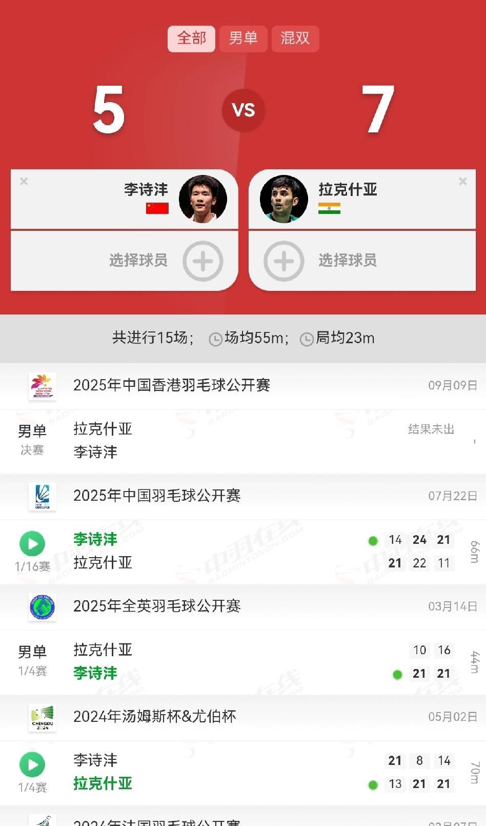 2025年中国香港羽毛球公开赛,男单半决赛周天成21-23,20-22惜败拉克什亚,拉克什亚决赛对阵李诗沣,从过往交手记录来看,拉克什亚7-5暂时领先李诗沣,但最近两次交手都是李诗沣获胜,期待李诗沣夺冠。