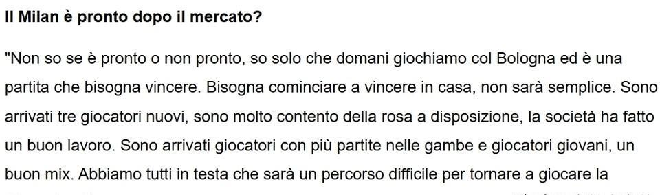 米兰与博洛尼亚之战只有一个结果就是取胜!阿莱格里与博洛尼亚赛前发布会接受采访表示博洛尼亚是一支真正的强队,他们速度快,技术精湛,比赛强度也很高,博洛尼亚是一个难以对付的对手,明天我们需要做得更好,我们将取得比赛的胜利。 阿莱格里说我对目前的阵容非常满意,俱乐部也做得很好,我们拥有一支足够竞争力的球队,新老搭配十分合理,这是俱乐部努力工作的结果,每个人都会为胜利而努力,为我们的赛季既定目标而努力,我们的目标是重返欧冠赛场。 对于球队现在伤病等问题,阿莱格里表示我们有很多重要球员不能上场,这给我们的比赛带来了一些困难,也正是因为这些困难我们才要更加团结,更加注重比赛细节,米兰对于所有对手都会全力以赴争取胜利。有准确消息说普利西奇将不会作为主力出战,同时恩昆库也不会进入主力阵容,普利西奇与恩昆库是否会替补登场要看比赛情况而定。