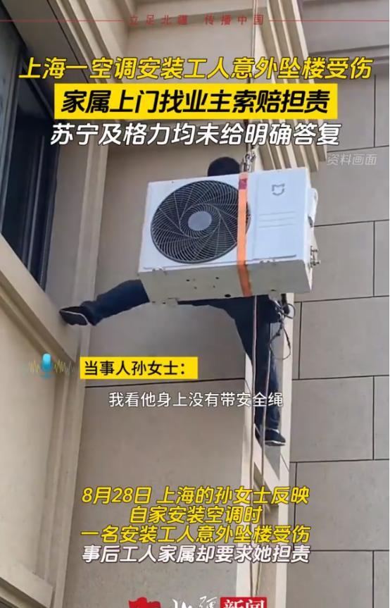 “讹人讹出新高度!”8月,上海一女子买了2台空调,师傅很快上门安装,结果,刚装了一会儿,女子就听到屋外“砰”的一声巨响,她跑过去查看,发现师傅竟然意外坠落,躺在楼下不省人事,女子将师傅送到医院,诊断全身多处骨折!不料,事后伤者家属找到女子,认为是她的责任,要求她赔偿! “是你家里装空调,怎么能不管我家人掉下来的事?”如果换作你听到这句话,估计第一反应会是愣住。 今年8月,女子叫来了安装空调的师傅,本来就是正常的家电安装流程,没想到装到一半,屋外突然传来“砰”的一声巨响。女子吓坏了,赶紧跑出去查看,结果发现师傅竟然从高处坠落,整个人躺在楼下不省人事。 那一瞬间,她慌了神,连忙把人送到医院,结果诊断是全身多处骨折,情况相当严重。 照理说,女子第一时间把伤者送医,已经尽了最大的善意和人道责任。可让她万万没想到的是,事后伤者的家属却找上门来,认为责任在她身上,要求她赔偿。 这一幕,真是让人看得哭笑不得:空调是她花钱买的,安装工人是商家派的,事故是在安装过程中发生的,结果她却要背锅? 这事一曝光,很多网友都炸了,有的直接怒怼:“这家属逻辑离谱!难不成谁家装个灯泡,工人踩凳子摔了,也要屋主赔?”也有人心疼女子:“好心第一时间送医,结果却换来这样的待遇,真是寒心。” 说实话,看到这里,我自己心里也挺不是滋味的,因为这种事情,搁谁身上都可能遇到。我们买家电、找安装、请维修,谁会想到工人会出事?可一旦意外发生,责任到底该怎么算? 按道理讲,安装工人在作业中发生意外,负主要责任的应该派出安装人员的公司或者平台。因为工人是在工作,属于工伤范畴,而客户只是正常消费,根本没有义务为工人的安全负责。 但问题是,现实中有些商家和公司为了省钱,找的基本都是临时工、兼职工,甚至外包工。一旦出事,就往后缩手,把责任甩给无辜的消费者。而消费者一般没有这方面经验,一旦家属来闹,很多人一害怕,就会选择私下赔钱了事。 这样一来,商家拍拍屁股走人,受伤工人和家属得点钱,可消费者却成了替罪羊。 我觉得,上海这起事件之所以引发热议,就是因为它把一个老问题摆到台面上:普通人在善意救助别人后,却被反咬一口。就像之前不少救助事件一样,好心人反而担责,长此以往,谁还愿意伸出援手? 其实也能理解工人家属的心情,亲人受了重伤,他们肯定希望有人负责。但再怎么说,也不能乱找人背锅,真正该追责的,是工人所在的公司。毕竟女子没有给工人派任务,更没有强迫他们冒险施工,凭什么要她赔? 希望这件事能有一个合理的解决方式,不要让本就好心救人的女子更加心凉。 信息来源: 北疆新闻丨《上海一空调安装工人意外坠楼受伤,家属上门找业主索赔担责,苏宁及格力均未给明确答复》 文丨小王 编辑丨史叔