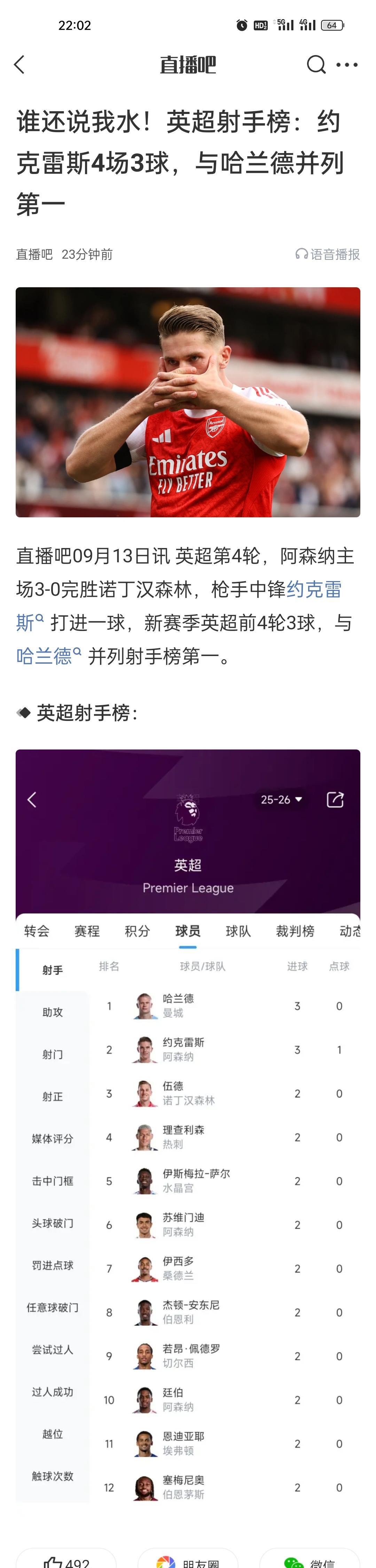 谁还说我水!英超射手榜:约克雷斯4场3球,与哈兰德并列第一。 哈弗茨很硬,但是吃饼容易噎着,进不进球还要看运气。约克雷斯更偏向于纯射手,只要队友把饼送到嘴边,大概率是能吃下去的,随时都感觉有机会进球。这是我的观球感受。 只要能跑到点上,射术应该是队内第一,但是就是很少能跑到,打实力强点的很难有表现,但是主场虐菜都能进球保证主场虐菜全胜就值回身价。 其实真的是对他的支援不够,很难捞到起脚射门的机会,一旦有机会,他的射门准星绝对是数一数二的!所以塔子真要在训练中加强这一点。