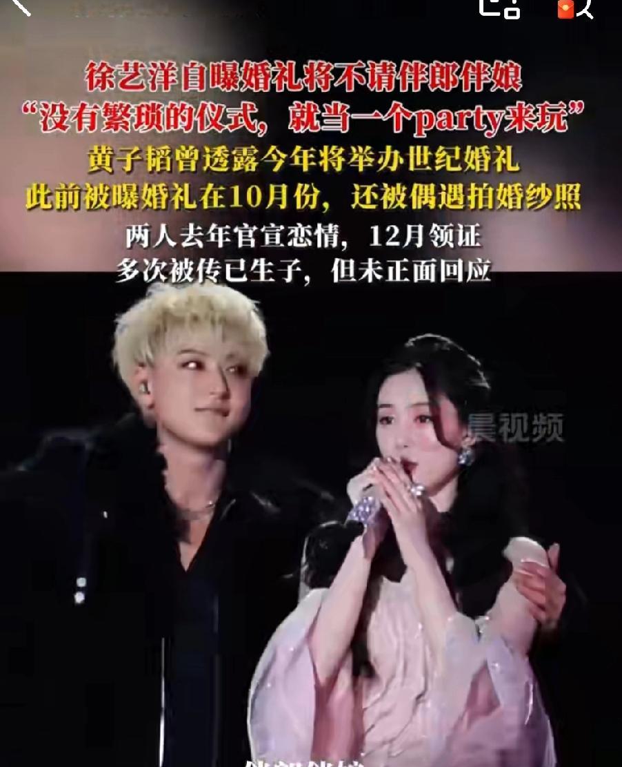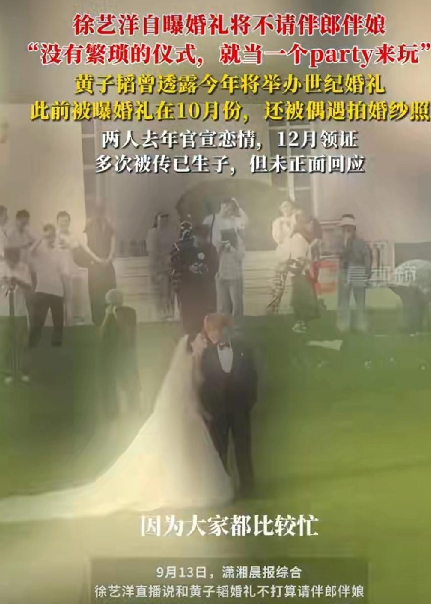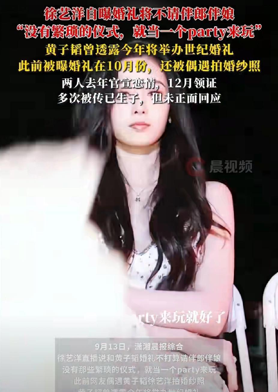9月13日,据潇湘晨报综合报道,徐艺洋在直播中透露,她与黄子韬的婚礼不打算设置伴