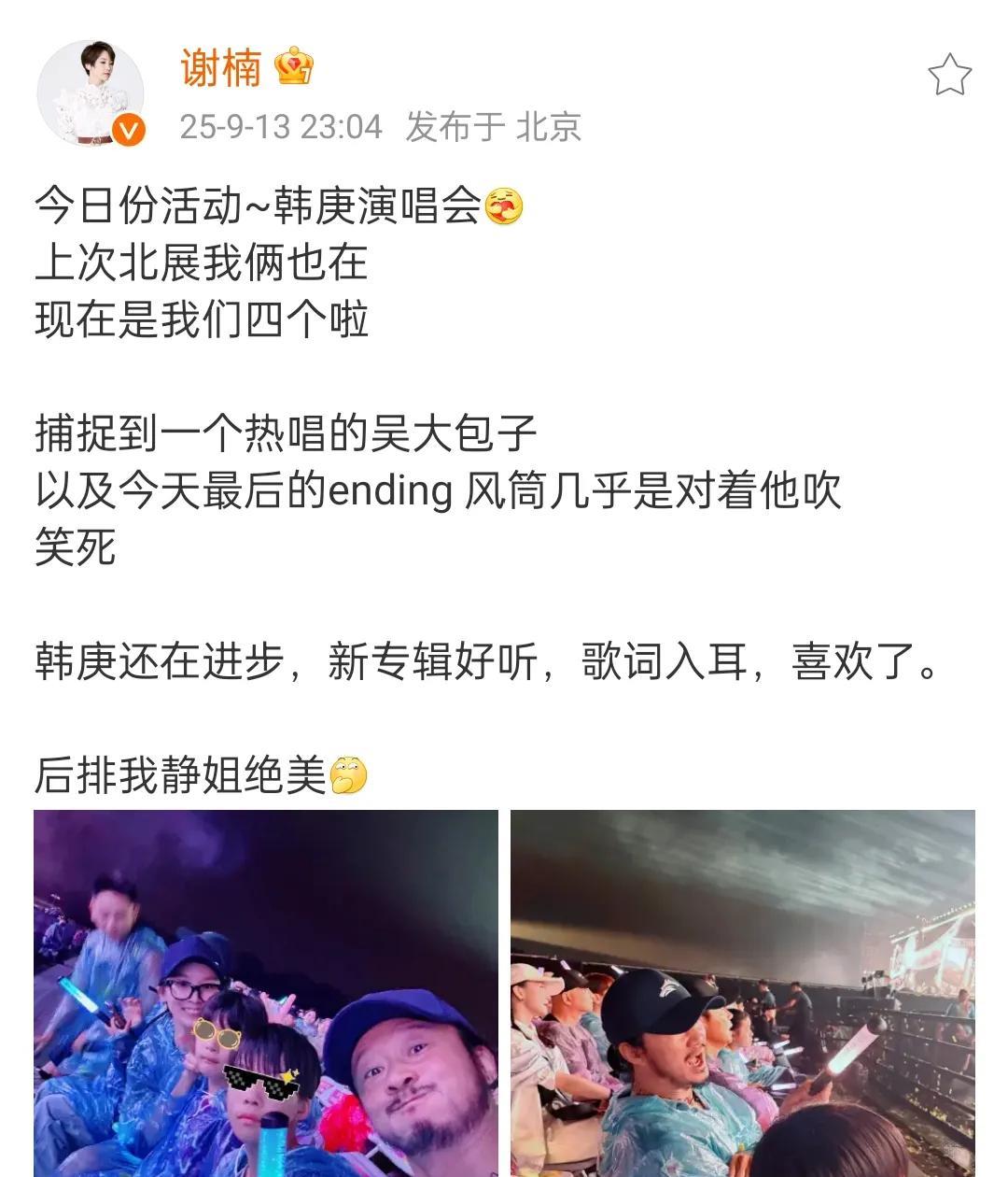 吴京谢楠一家四口去看韩庚演唱会,吴京拿着手机自拍,对着镜头嘟嘴卖萌看上去心情很好,一家人合照好有爱!