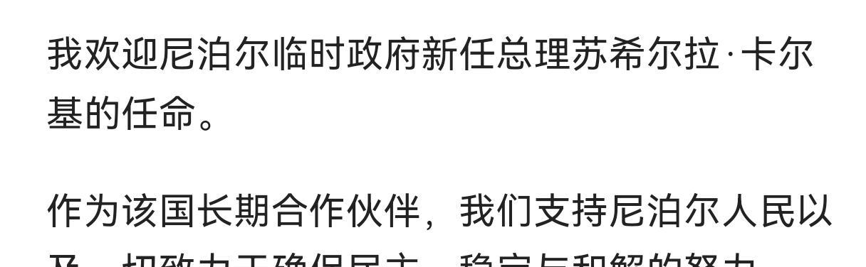 美西方在我们周边策划颜色革命,必须警惕。只要不听美西方的话,就能轻易策反成功,这太可怕。就像是俄罗斯,被颜革的乌克兰宁愿战斗到最后一个乌克兰人,被洗脑到死都要去做美西方的好生活。我们也要做各国的思想工作,不要妄想他们能自主觉醒。 “我欢迎尼泊尔临时政府新任总理苏希尔拉·卡尔基的任命。 作为该国长期合作伙伴,我们支持尼泊尔人民以及一切致力于确保民主、稳定与和解的努力。”