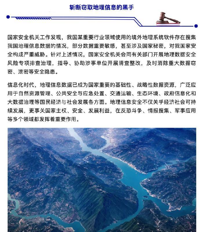 【转发周知!#国安部提醒谨防地理信息泄密#】国家安全机关工作发现,我国某重要行业领域使用的境外地理系统软件存在搜集我国地理信息数据的情况,部分数据重要敏感,甚至涉及国家秘密,对我国家安全构成严重威胁。针对上述情况,国家安全机关会同有关部门开展地理数据安全风险专项排查治理,指导、协助涉事单位开展清查整改,及时消除重大数据窃密、泄密等安全隐患。详戳↓