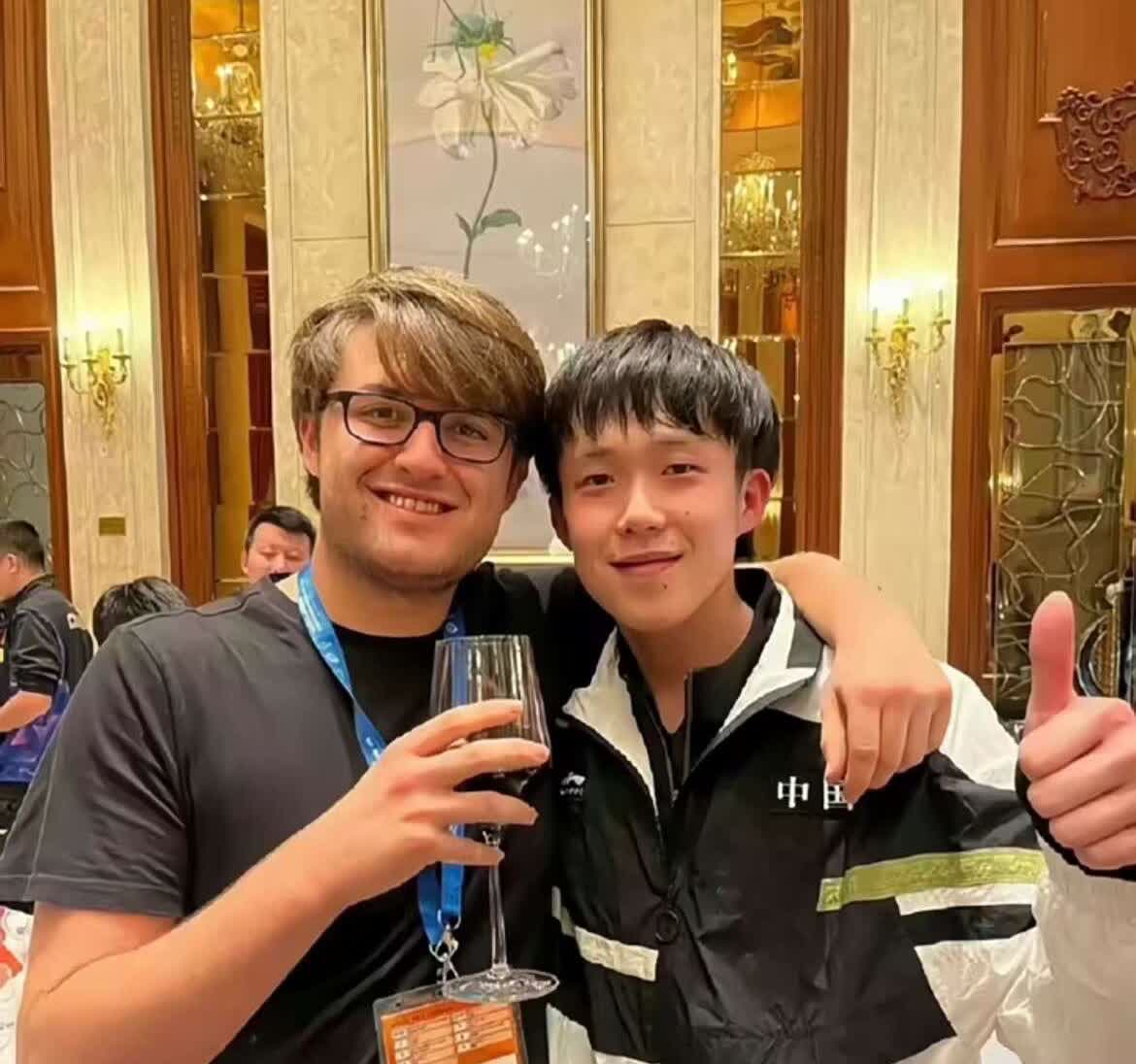 今天采访王楚钦的人和搂着他合影的人竟然是同一个人。 王楚钦4-0林昀儒之后,内场采访, 今天换了一位主持人, 看到名字原来是wtt的另一个常驻解说员Fraser, 在很多年前,和王楚钦搂着合影,两个人脸都红扑扑的。 现在看,王楚钦还是王楚钦, 身边的这位由哥哥变成了大叔,变化还是蛮大的。 身材的变化最直观。