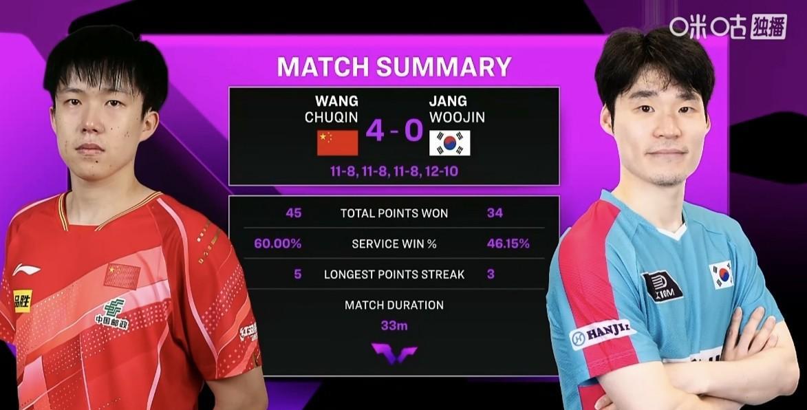 横扫张禹珍,听听王楚钦赛后怎么说 今天下午的澳门冠军赛男单半决赛,王