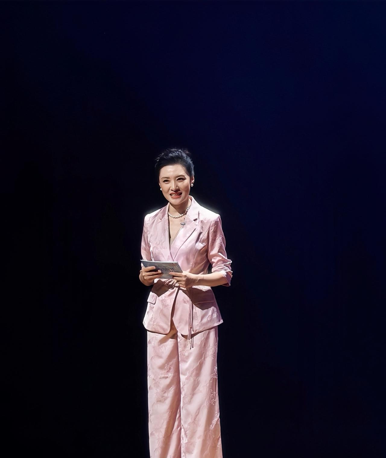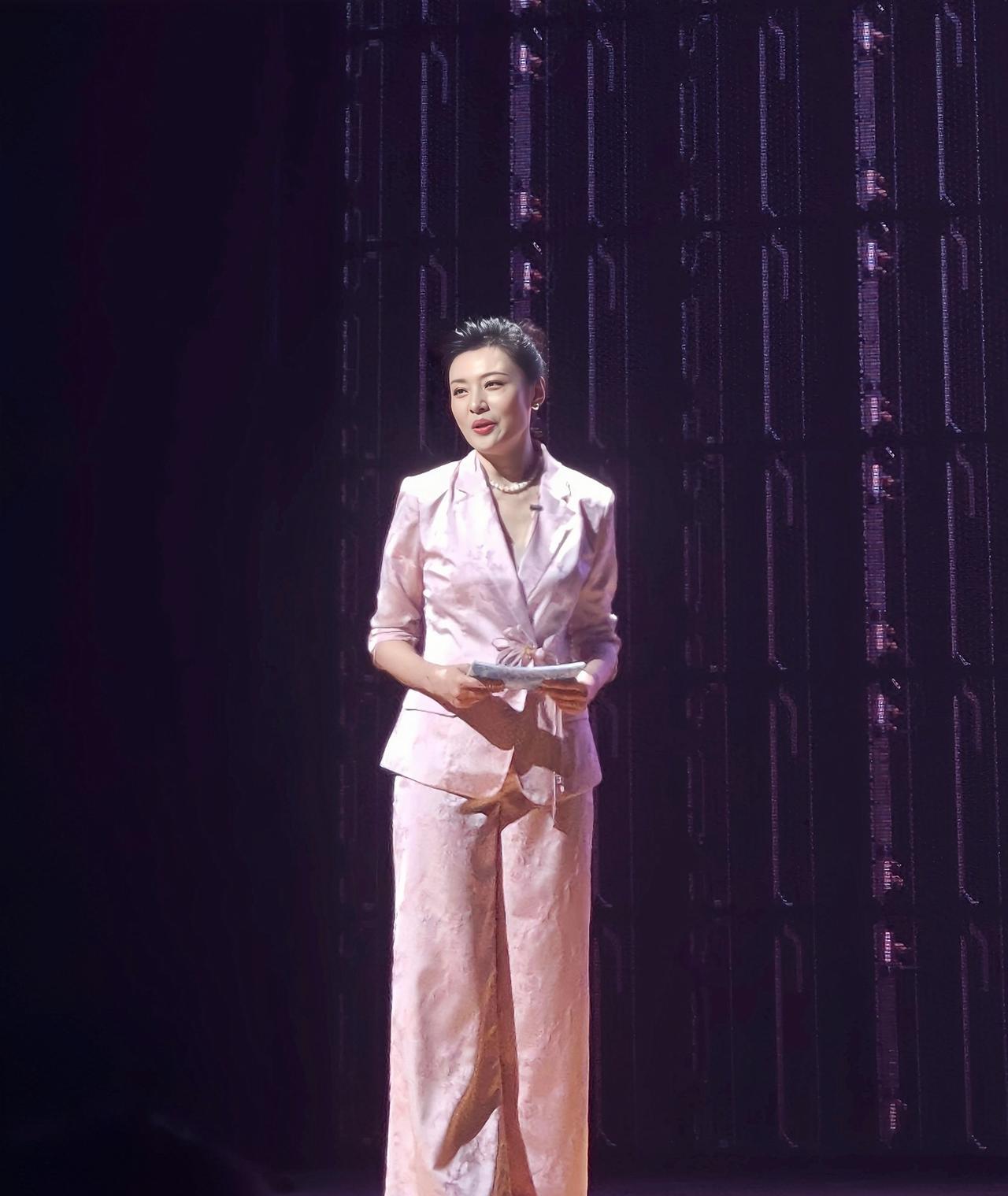 9月13日晚,周涛现身天津,参加戏剧节的画面,她一身浅粉色西装搭配Look,真的