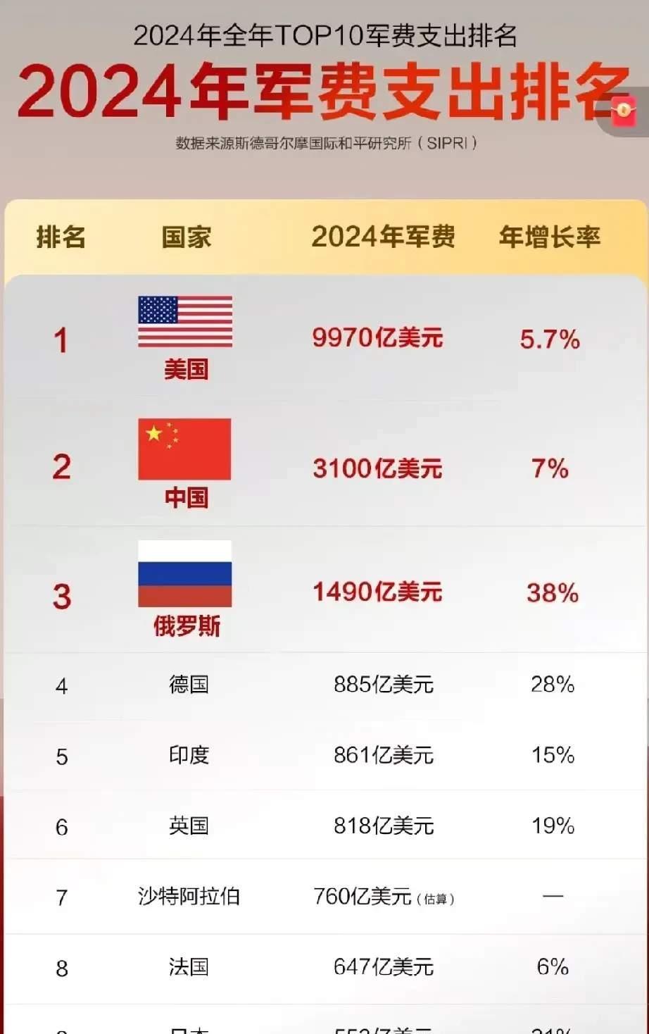 2024年是2.2万亿元,这个数据是不是有点高,如果这钱缩个一万亿出来,用到教育医疗,那么大家的幸福指数肯定会更高。 我认为这个东西真的没必要这么多,从目前看放眼全球,能挑战我们的,凑不齐一桌麻将,那么这么3100亿美元,还是太高了,这些钱如果用来支持一些年轻人,大学毕业生,我想这世界会更美好。 对世界真正的贡献应当是在教育上,医疗上,而不是武器。
