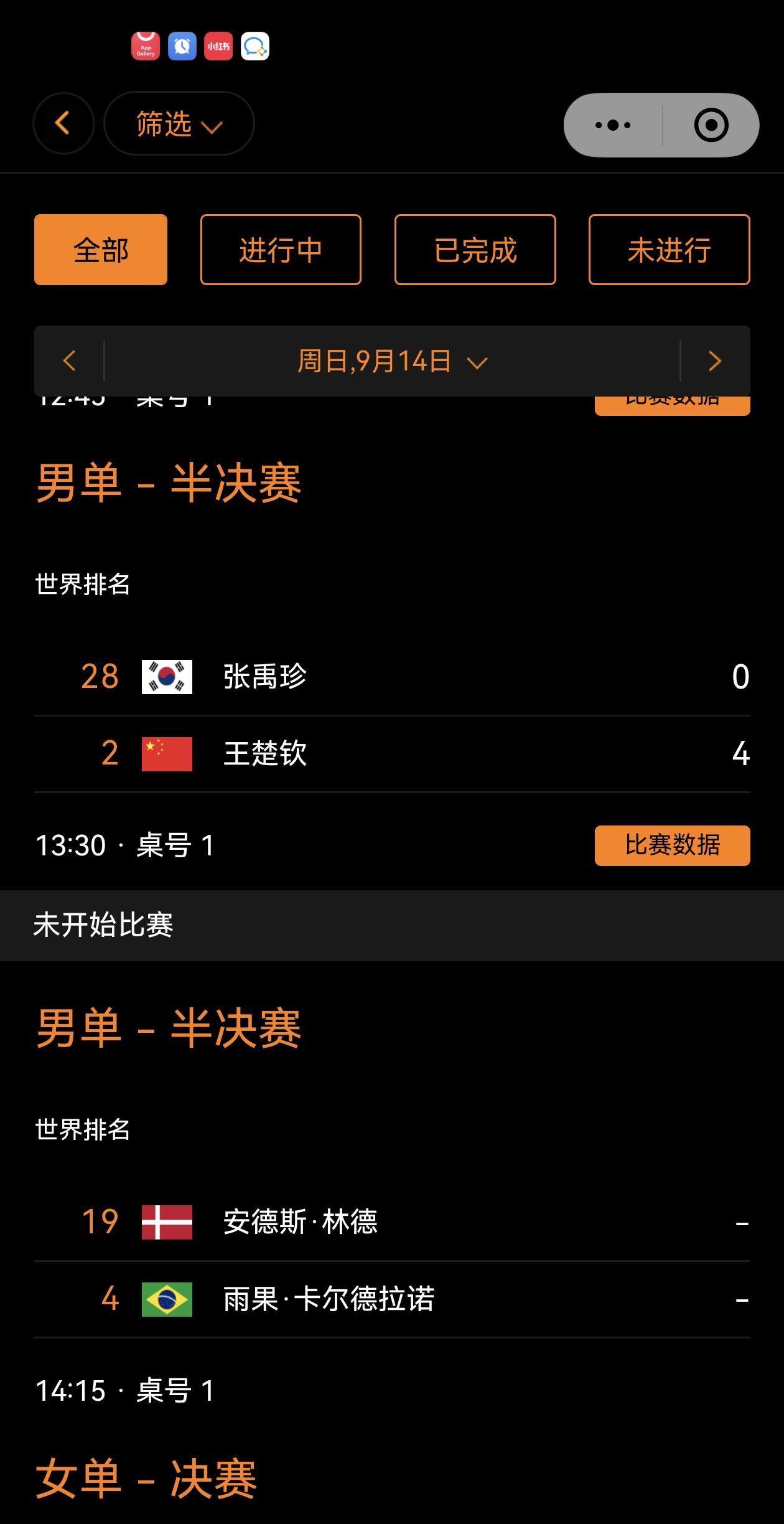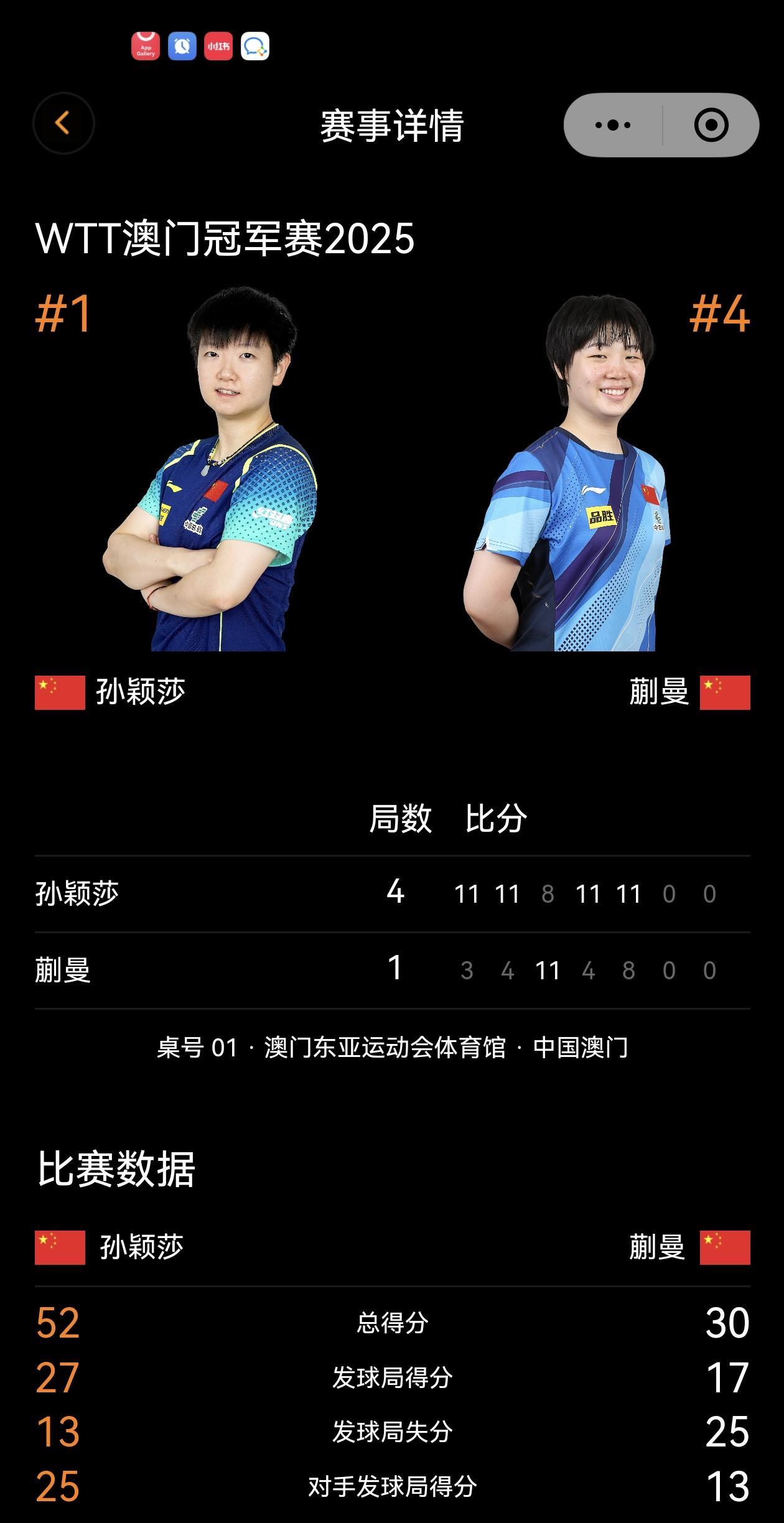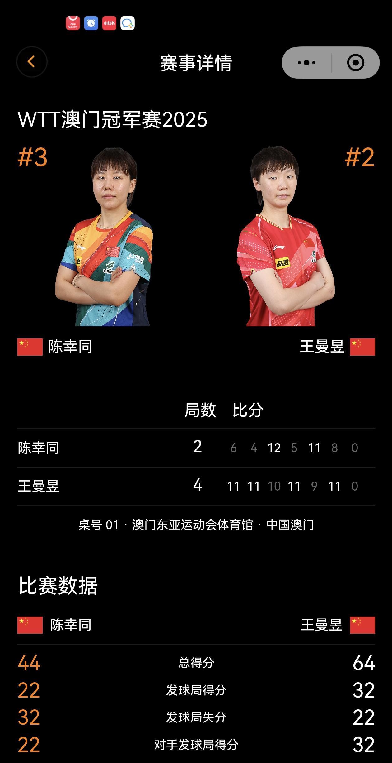 WTT澳门冠军赛2025(9.9-14):9.14午场,对得起观众的大赛,半决赛,王曼昱4:2陈幸同,孙颖莎4:1蒯曼,王楚钦4:0韩国张禹珍,晋级决赛。 #WTT澳门冠军赛# #王楚钦# #孙颖莎# #王曼昱#