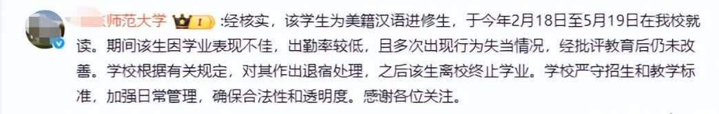 美国黑人女留学生在外网侮辱中国老师和同学,不接受批评教育,自行离校终止学业。 这个黑人女留学生,不仅成绩不佳,而且纪律观念淡薄,经常逃课,还经常和室友发生冲突,学校对她进行批评教育,没有任何改观。 于是把她进行退宿处理。但她“气性”高,自己离校终止了学业。对于这样的害群之马,早处理为妙。 这个女留学生竟然在外网,用“biaozi”一词来侮辱老师和同学。显然她知道这个词的含义,学习成绩差,好的没学到但差的却活学活用。 对于外国留学生一定不能特殊化,严格考核严格管理,一视同仁,不遵守纪律,不遵守公序良俗的,经教育无果,一律开除。